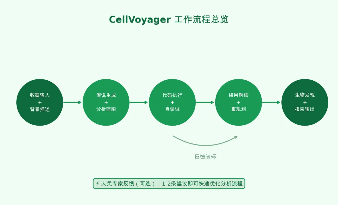 CellVoyager 并非”纯自动化”,而是以人为核心的协作式工具:单分析包含5-8个步骤,串行运行耗时15-30分钟,支持分析完成后接收人类反馈,仅需1-2条专家建议,即可快速优化分析流程、拓展分析维度,大幅提升结果的科学价值。