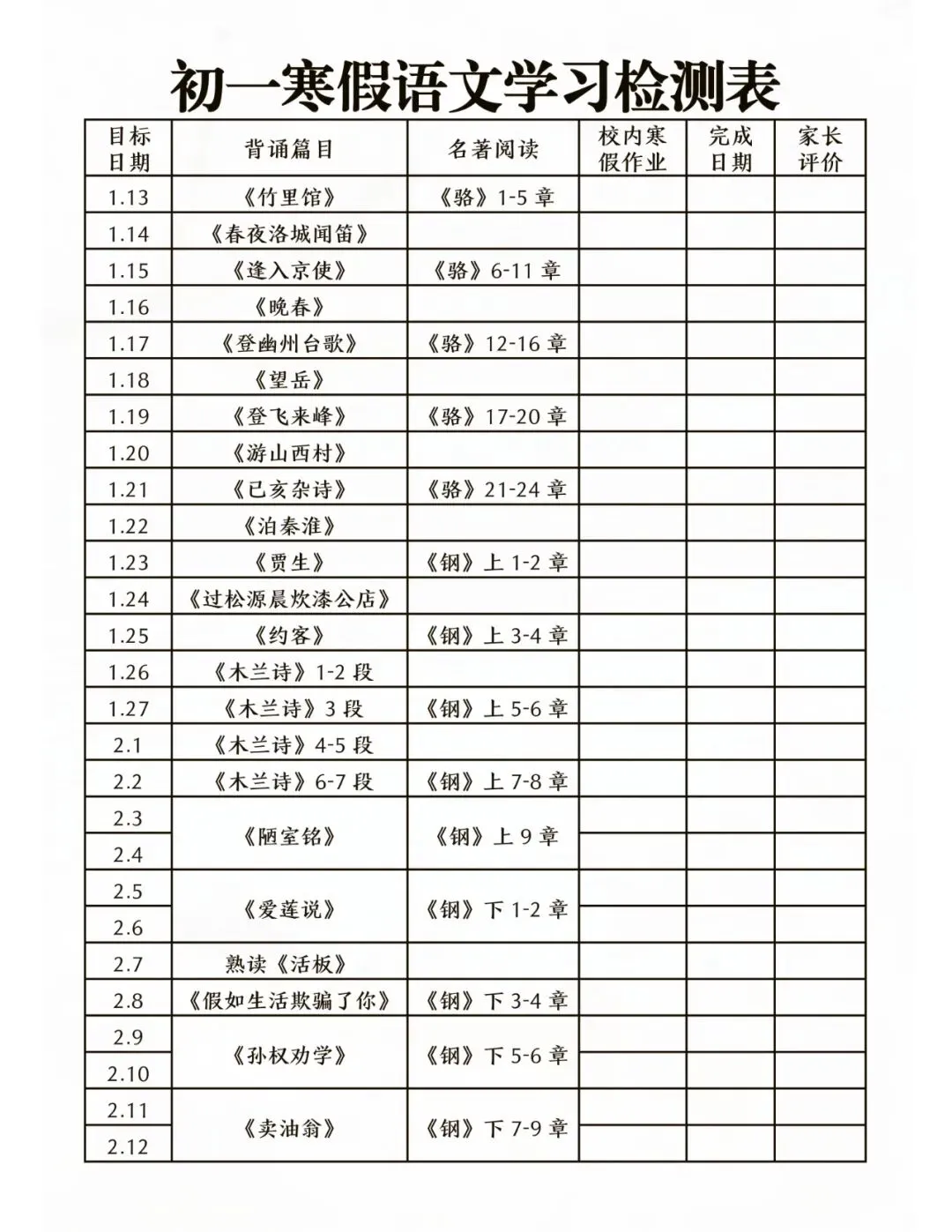 老师为大家整理好了资料:七年级下册语文寒假学习检测表 电子版可打印!