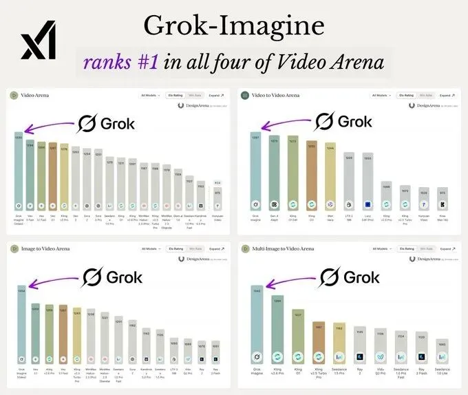 在最新的视频生成技术评测中,Grok-Imagine模型实现了突破性表现,在DesignArena平台的视频生成综合排行榜上包揽了全部四项冠军。该模型在视频生成领域的关键细分任务中均位列第一,包括视频竞技场、视频到视频生成、图像到视频生成以及多图像到视频生成。这一成绩标志着视频生成技术的一个重要里程碑,表明该模型在处理不同类型和复杂度的视频生成任务时都展现出了卓越的能力。 这一突破的背景是视频生成技术正处于快速发展的竞争阶段。近年来,多家科技巨头和初创公司相继推出了各自的视频生成模型,如Veo 3.1、Sora和Kling等,这些模型在生成视频的真实感、连贯性和创意性方面不断取得进步。DesignArena作为业内公认的基准测试平台,其排行榜结果对于评估模型性能具有重要的参考价值。Grok-Imagine的全面领先,特别是在多模态输入(如图像到视频)任务上的优势,可能源于其在模型架构、训练数据规模或生成算法上的创新。这种全面超越不仅体现了技术上的领先,也可能对相关应用领域产生深远影响,例如在影视制作、游戏开发、广告创意和虚拟现实等需要高质量视频生成的行业中,更强大的生成能力将显著提升内容创作的效率和质量。此外,这一进展也预示着人工智能生成内容(AIGC)领域竞争将更加激烈,可能加速相关技术的商业化应用和标准化进程。从技术发展趋势来看,视频生成模型正朝着处理更复杂场景、理解更长时序关系和实现更高分辨率的方向发展,此次评测结果无疑为这一发展路径提供了有力的实证支持。