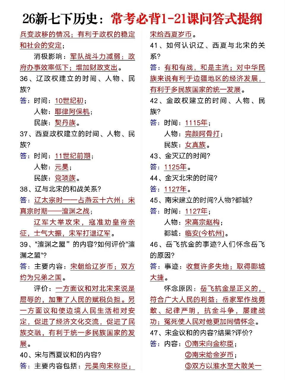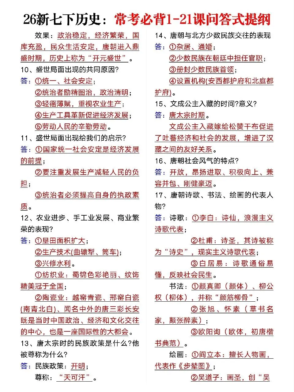 【26版新教材】七年级下册历史1-21课重点知识问答式提纲,电子版可下载打印!