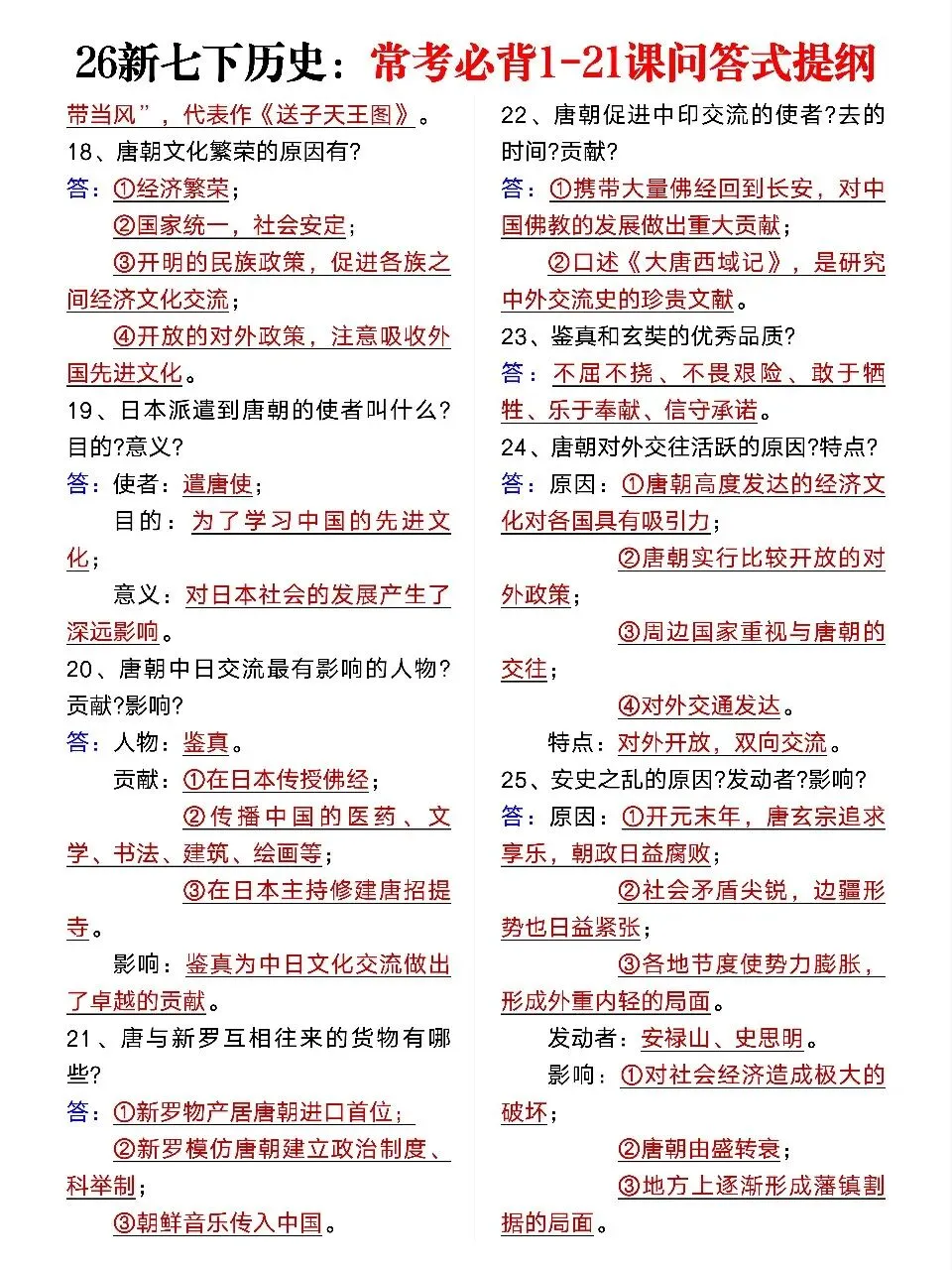 小鹿老师今日分享:七年级下册历史1-21课重点知识问答式提纲