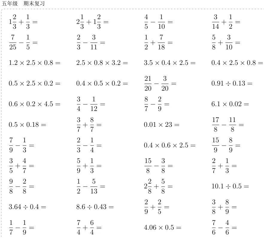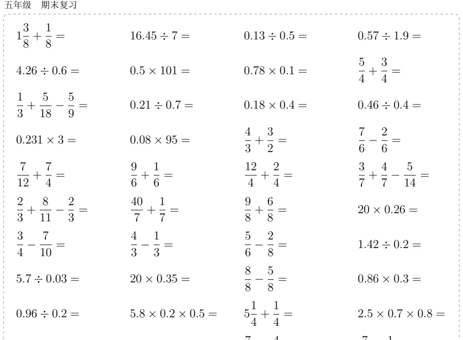 本文分享:小学数学五年级口算10000题(免费下载可打印)