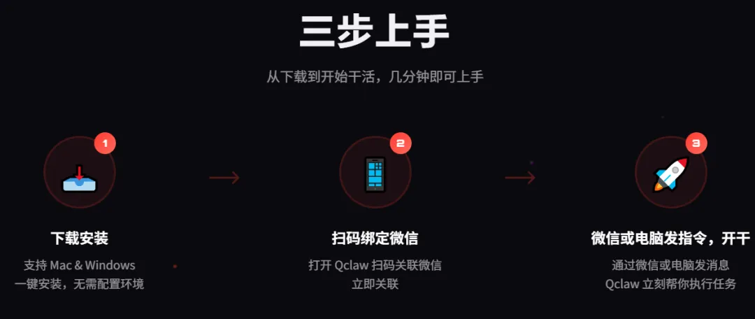 就在昨天,Qclaw开放了全员下载,不再需要邀请码的机制来完成软件的激活。根据官网的一个三步操作教程,整体下来没有任何操作难度,只需要选好安装目录后然后无脑下一步既可。