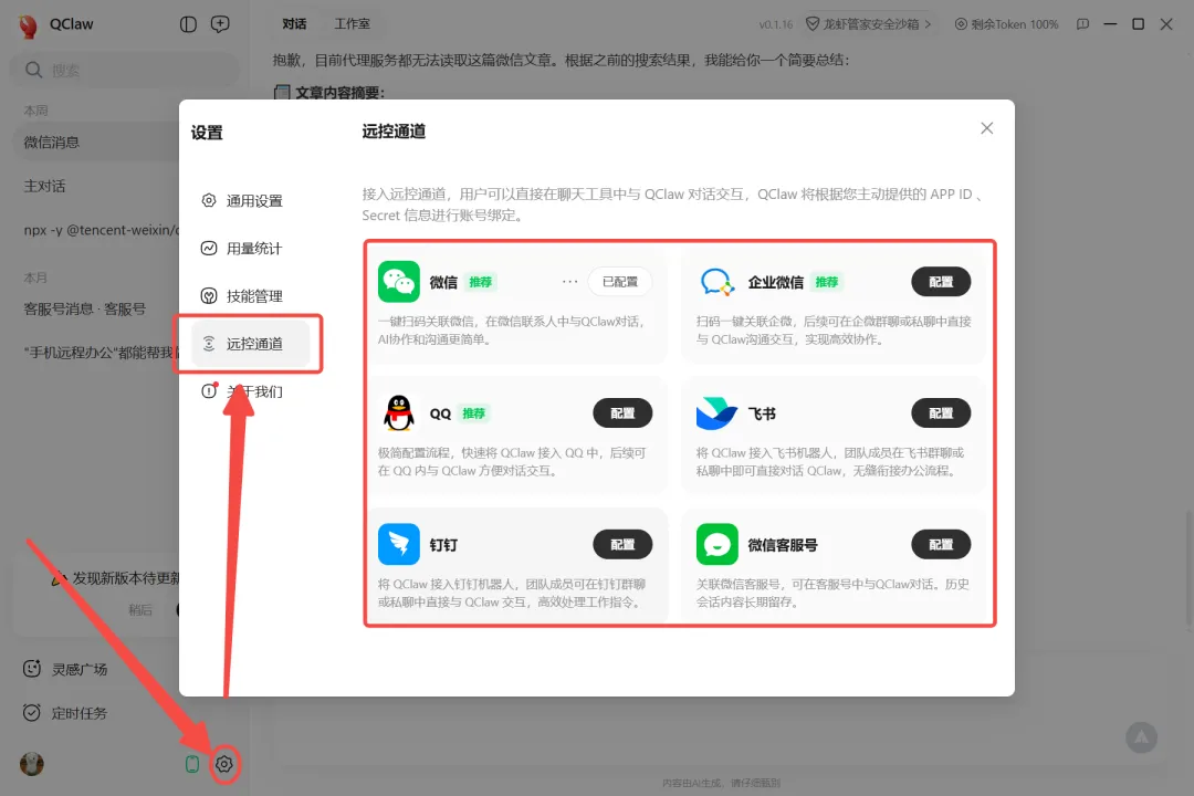 先登录Qclaw,然后点击左下角的人物头像部分中的“设置按钮”,他就会弹出通道的设置界面