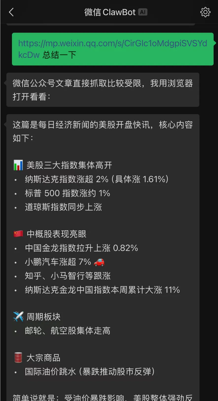 • 微信ClawBot 插件在逐步放量中。更新至最新版本。