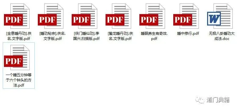 1.[侠门睡仙功].李国兴.扫描版.pdf2.[全息睡丹功].佚名.文字版.pdf3.[睡功秘宗].佚名.文字版.pdf4.[蛰龙睡丹功].佚名.文字版.pdf5.一个睡五分钟等于六个钟头的方法.pdf6.无极八卦睡功大成法.doc7.睡中修行.pdf8.睡眠养生有奇效.pdf