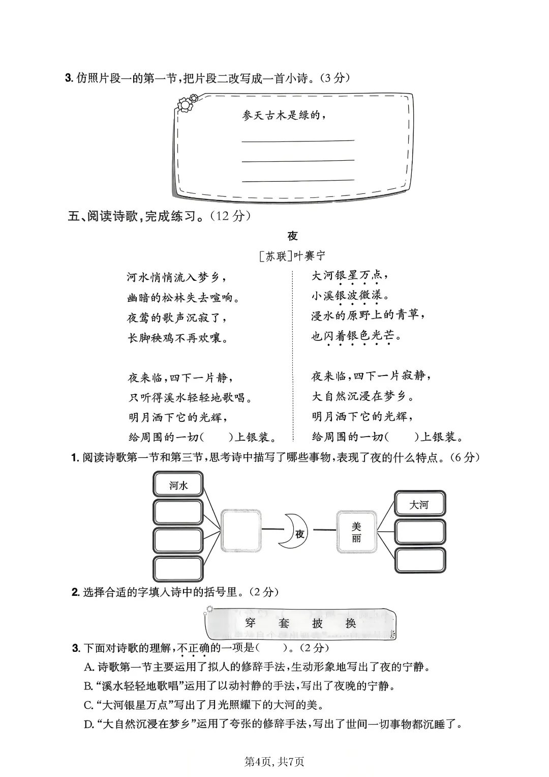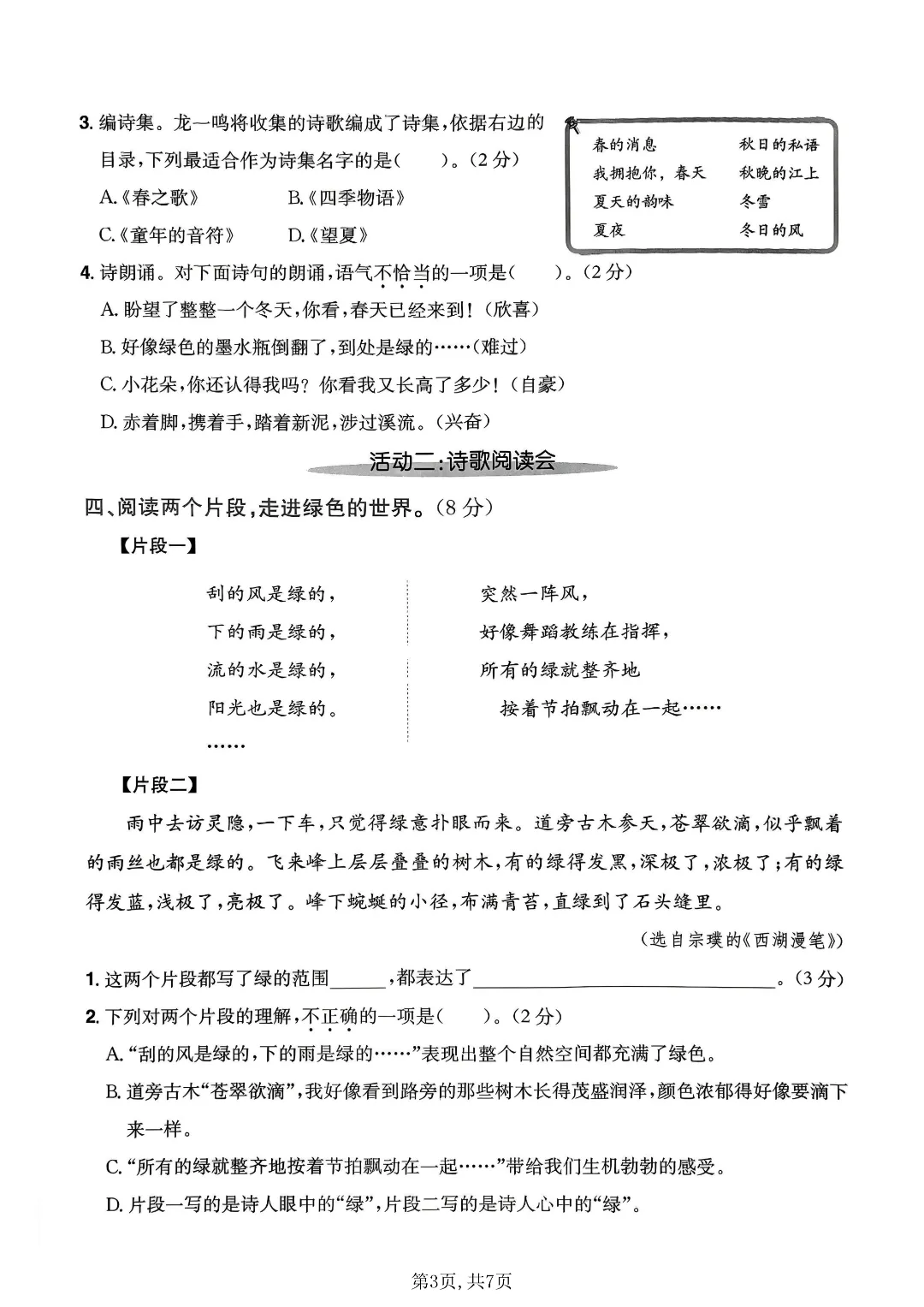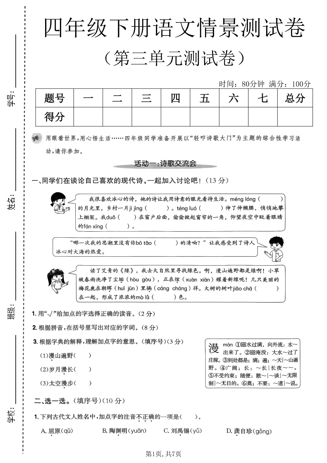 2026年春人教部编版四年级下册语文《第三单元情景测试卷》(含答案),共6套,电子版可下载打印。需要的家长可以打印出来,让孩子练一练!
