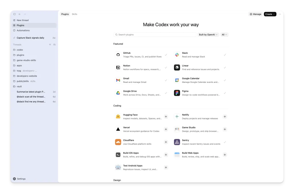 有趣的是,OpenAI将这些插件放在Codex UI的中心位置,在“新线程”按钮下方设有一个专用选项卡。点击该选项卡会进入应用中精选的目录。自助发布功能尚未推出,但对更多插件的支持即将到来。