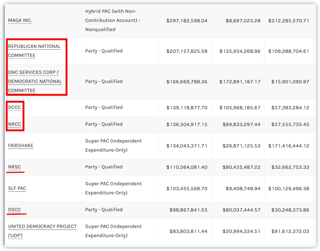 昨天介绍了与两党高度关联的六个超级政治行动委员会的最新数据(见下图),有读者朋友对这份数据提出质疑,在此声明:本人并不生产数据,只是数据的搬运工,下图中的数据来源于联邦选举委员会(FEC)的官网,最后三列的数据分别是:募集资金数据,花费资金数据和手中仍有可操作的资金数据。前两列相减(募集减去花费),并不等于最后一列,请大家不要弄错,因为图中的募集和花费数据是2026年选举周期,即2025年1月1日至2026年2月28日,最后一列的可操作资金,还包含了上个周期,即2025年前剩下没有花掉的资金!