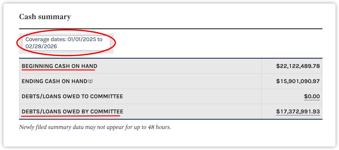 以民主党全国委员会(DNC)为例,2025年1月1日到2026年2月28日期间,共募集了1.66亿,花费了1.72亿,仅剩下1590万可操作资金。可以看出完全处于入不敷出的状态,之所以还有1590万现金,因为上个周期(2025年之前)还剩下了2212万,见下图,另外也可从图中看到DNC仍有1737的债务,综合来看,DNC的资金状况非常差!