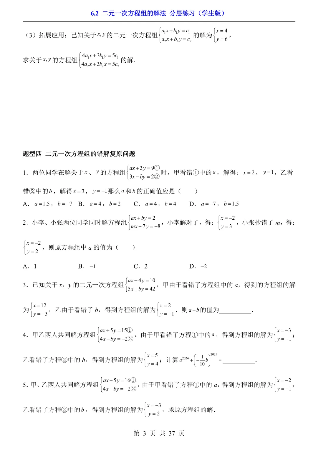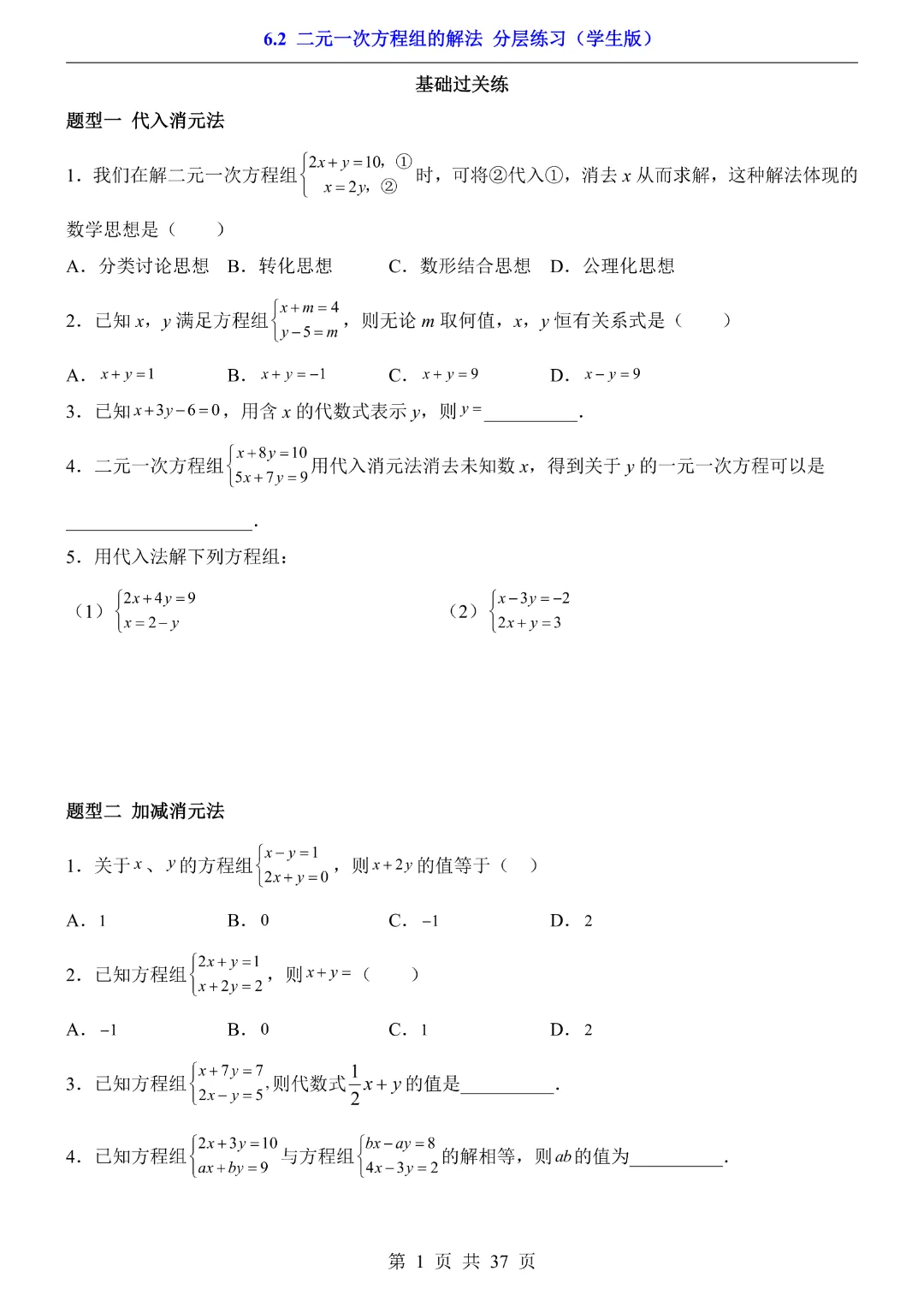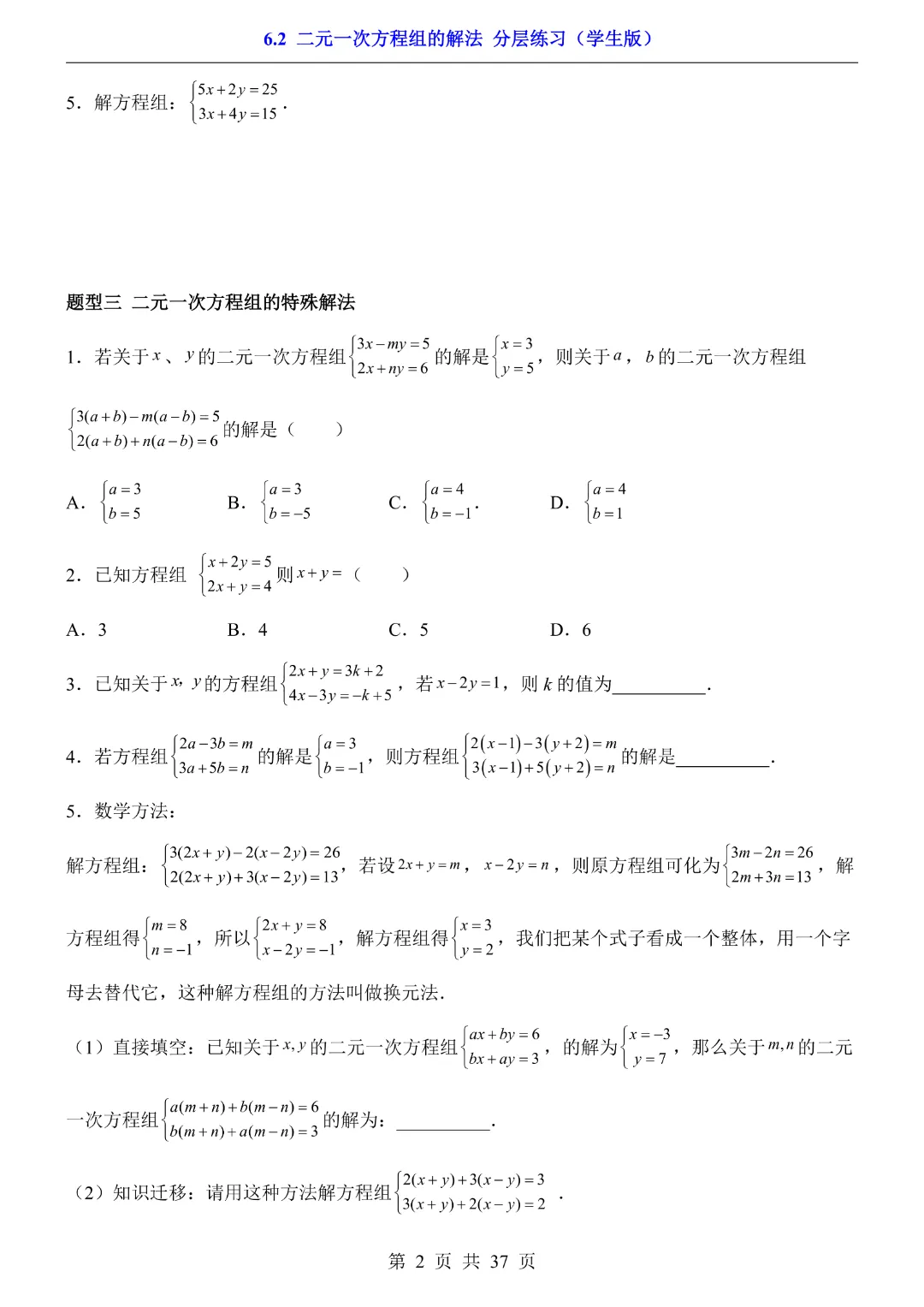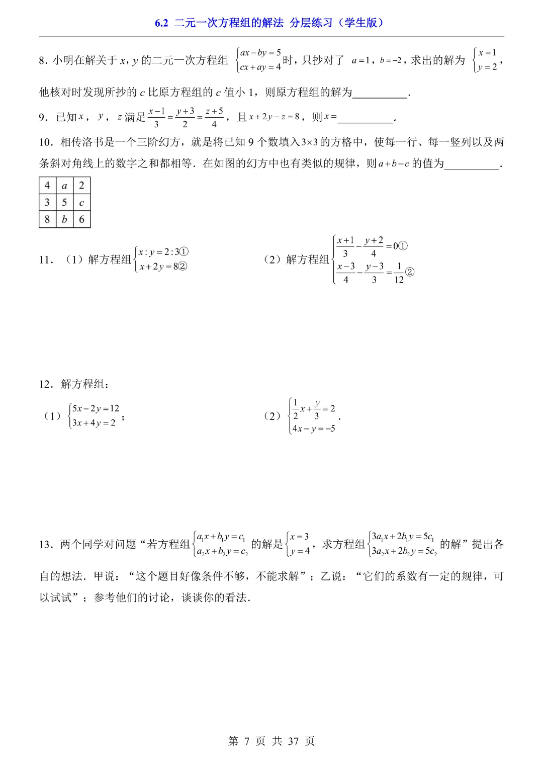 今日给大家分享的是:【七年级下册数学华师版】初一下册数学《6.2 二元一次方程组的解法 分层练习》带答案|完整高清电子版可打印