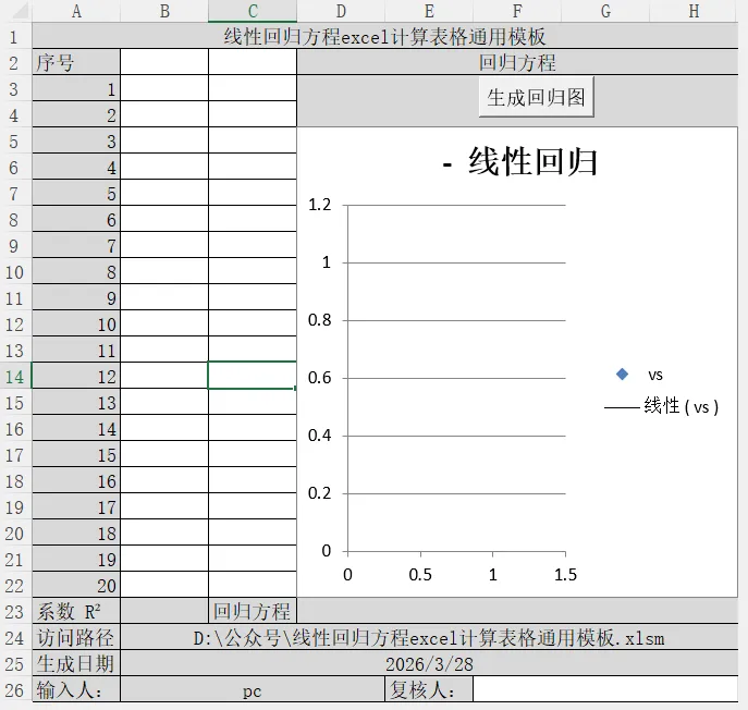 豆包接收表格制作需求后快速输出制作方案,我按照方案逐步完成单元格计算函数配置;其中自动生成线性回归图、获取当前用户名称、自动获取计算日期三项功能需通过编写三段宏代码实现。本环节并非一次性完成,因为我跟随豆包的初次答案去编辑时,发现不是完全有效的,特别是在回归图的自动更新、回归图的位置和尺寸大小的锁定方面,反反复复地不断向豆包反馈实际的执行效果,同时豆包根据实际的执行效果再次给出修改意见,在这个过程中花了很多时间。总结了一些注意事项: