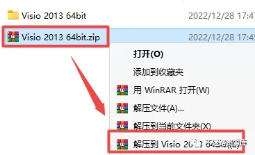 1.选中下载的压缩包,然后鼠标右键选择解压到”Visio 2013 64bit”(没有解压选项点这里)