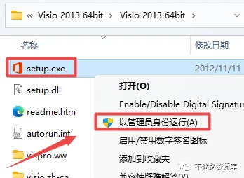 2.打开刚刚解压的文件夹,双击打开“Visio 2013 64bit“文件夹,鼠标右键点击“setup.exe”选择“以管理员身份运行”