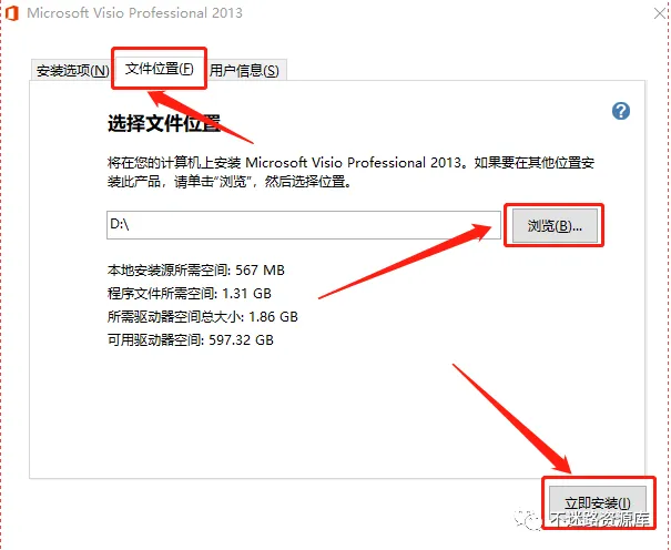 5.鼠标点击“文件位置“,选择软件安装路径,建议和教程中的保持一致,本例安装到D盘(将路径地址中的首字符C改为D表示安装到D盘,或者可以在其它磁盘里创建一个新的文件夹,安装路径不要出现中文),点击“立即安装“