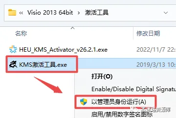 8.返回之前解压的“Visio 2013 64bit”文件夹,双击打开“激活工具”文件夹,选中“HEU_KMS_Activator_v26.2.1.exe”或者“KMS激活工具.exe”其中一个,鼠标右键点击“以管理员身份运行”