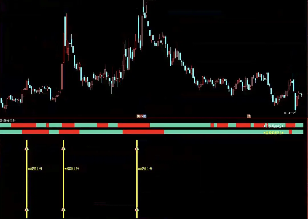 当所有条件同时满足时,指标会在副图中显示”★超强主升”的信号。