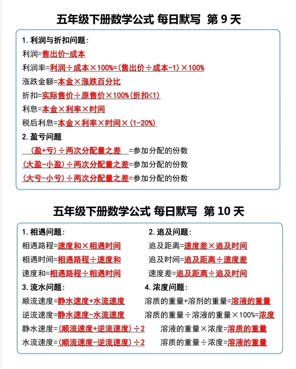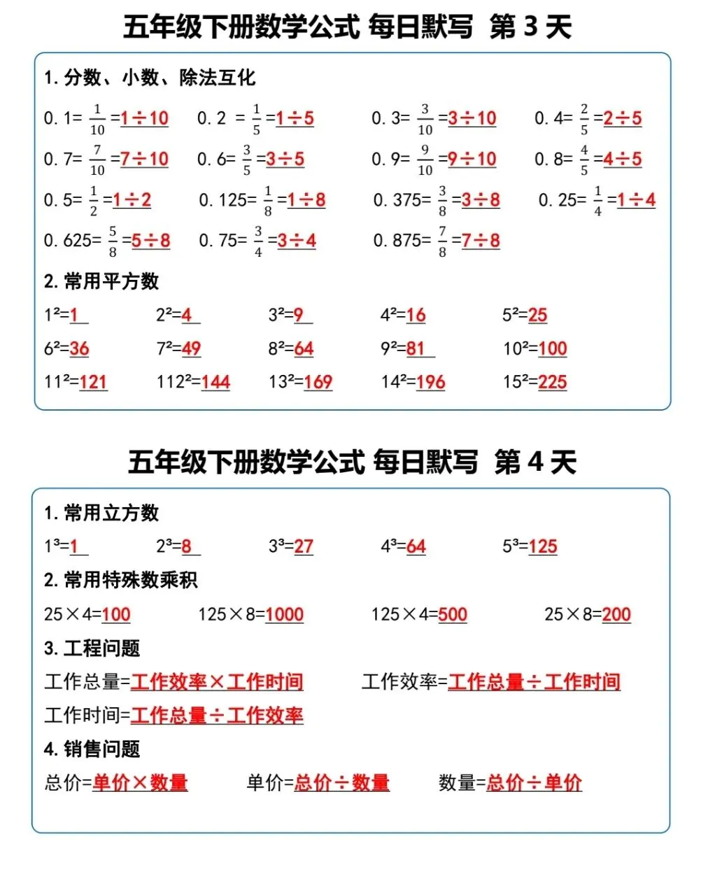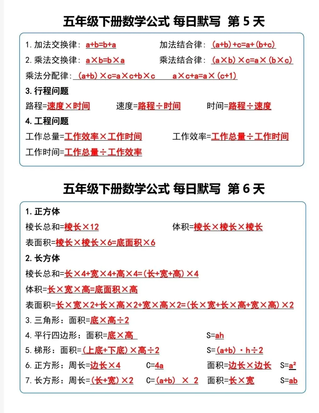 五年级(下)数学《重点必背公式概念汇总》电子版可下载打印