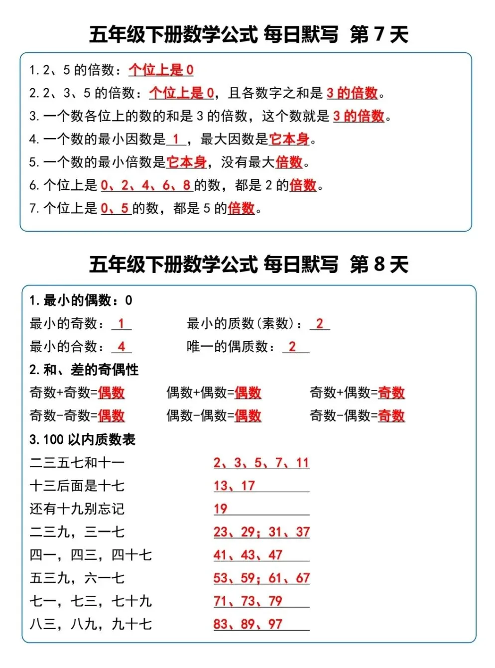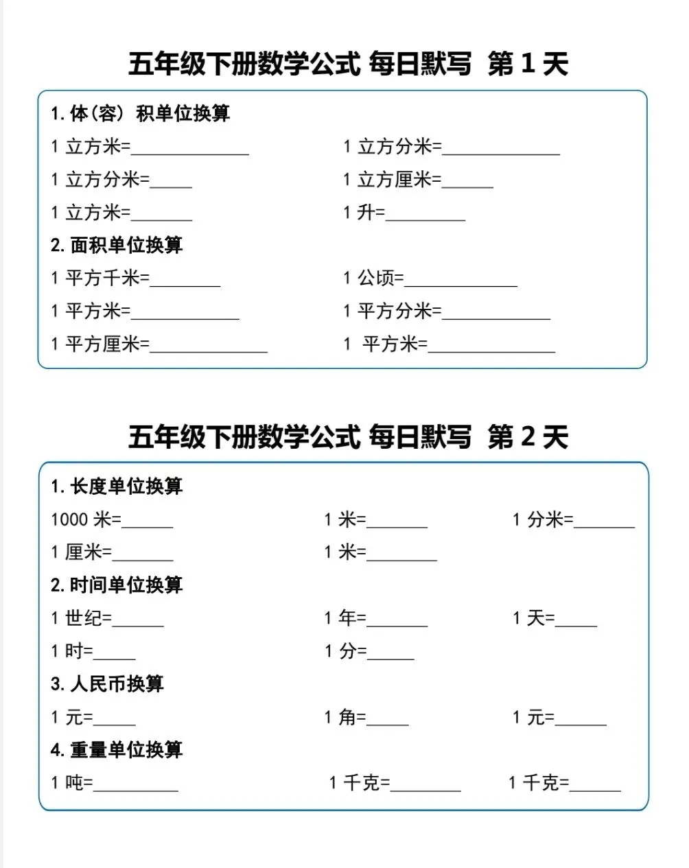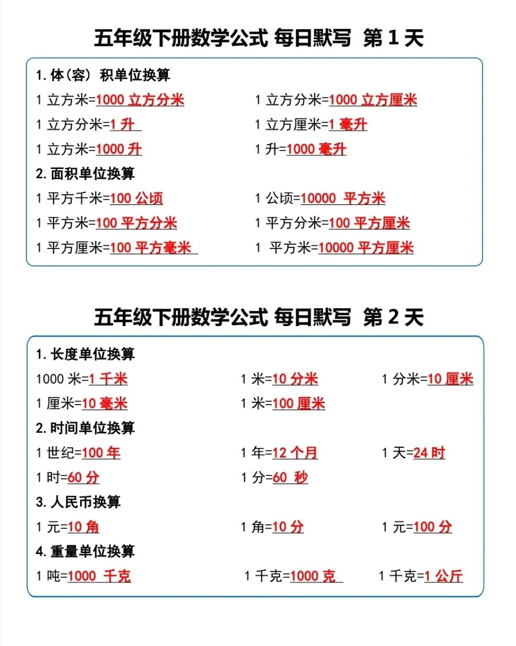 五年级(下)数学《重点必背公式概念汇总》电子版可下载打印