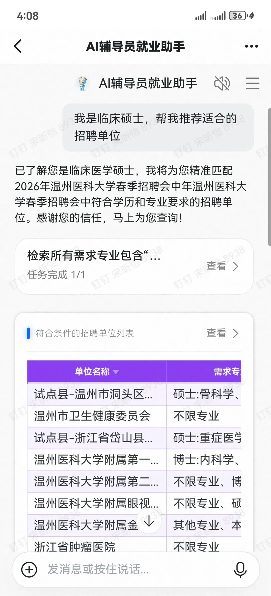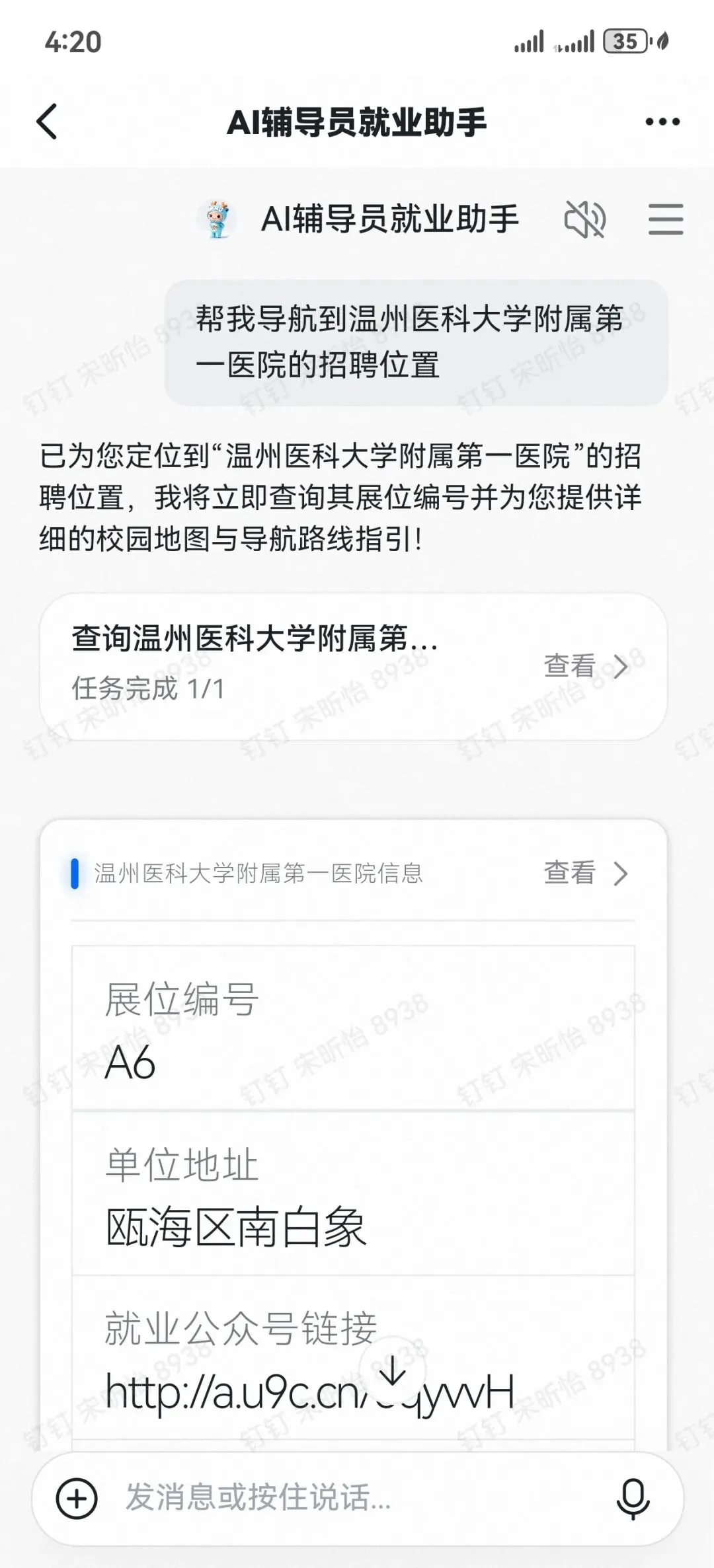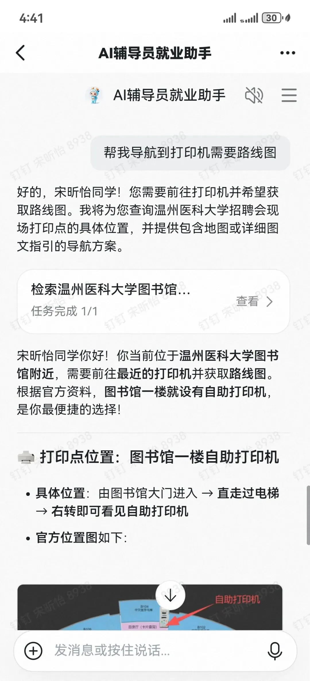 温州医科大学学生处推出 AI 辅导员就业分身招聘会导航(测试版),在 2026 年春季招聘会中为毕业生提供智能导航服务。毕业生可通过语音或文字与 AI 辅导员智能问答,快速获取展位分布、考场安排、周边打印点、招聘会全景地图及就业政策等信息,系统可智能推荐适配求职单位并精准导航至目标展位,高效解决找单位、找展位、找服务等难题,实现信息精准触达,全面提升春招服务效率与求职体验。