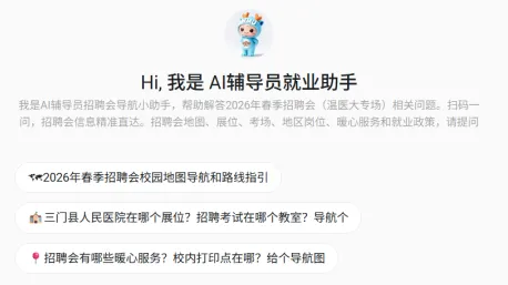 以智能赋能春招,用科技服务就业。AI 辅导员导航小助手集岗位匹配、精准导航、信息查询、便民服务于一体,全面优化现场求职流程,提升求职效率与体验。这个春招,让智能工具伴你同行,轻松斩获心仪 offer~
