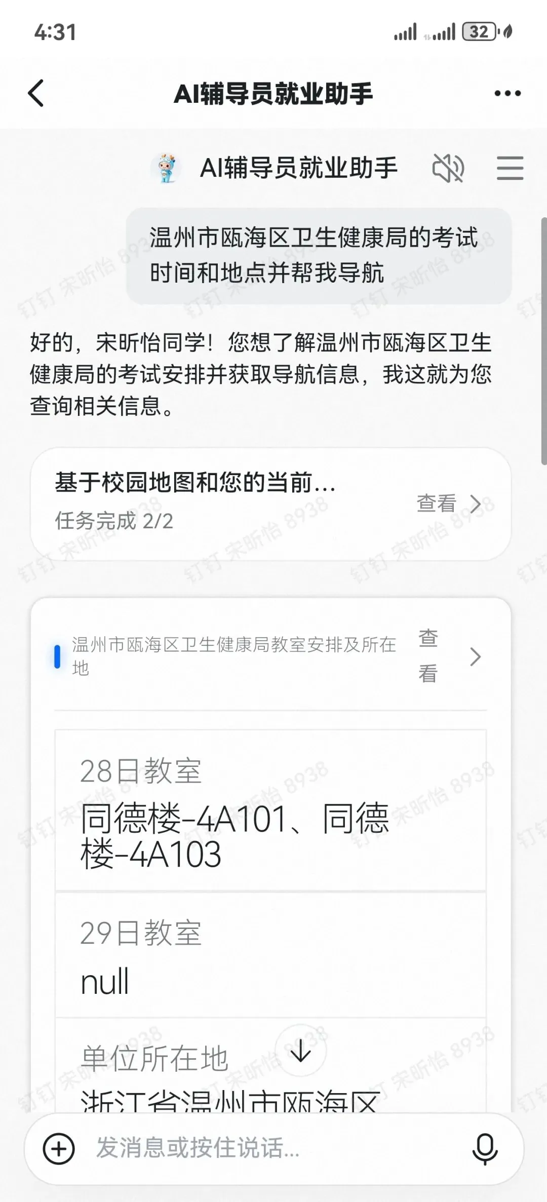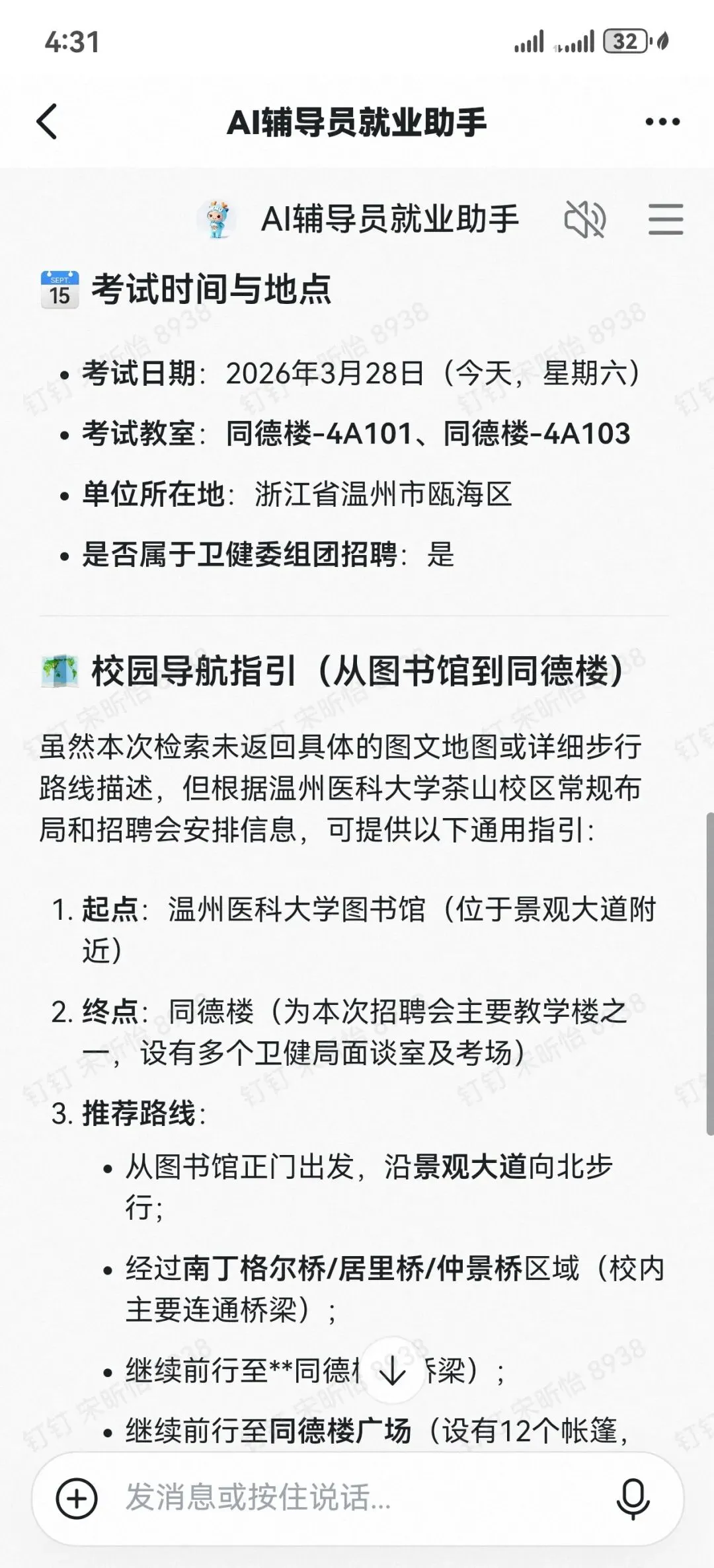 面对多场次、多单位的面试与考试,求职者常常面临信息记不清、场地找不到的问题。AI 辅导员可实时查询并展示各招聘单位面试时间、考试地点、候考区域等关键安排,信息准确、更新及时,帮助求职者合理规划行程,避免错过重要考核环节,让求职过程更从容、更有底气。