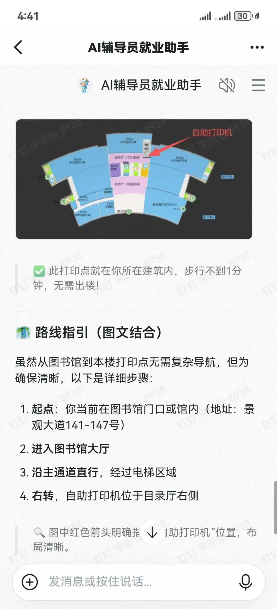 除核心求职服务外,小助手还充分考虑现场实际需求,可快速查询并导航至附近打印点位,方便求职者及时补充、打印简历及相关证明材料。同时支持查看招聘会整体布局、服务台、休息区、卫生间等公共设施位置,全程信息查询与位置指引精准可靠,一站式解决现场各类应急问题。