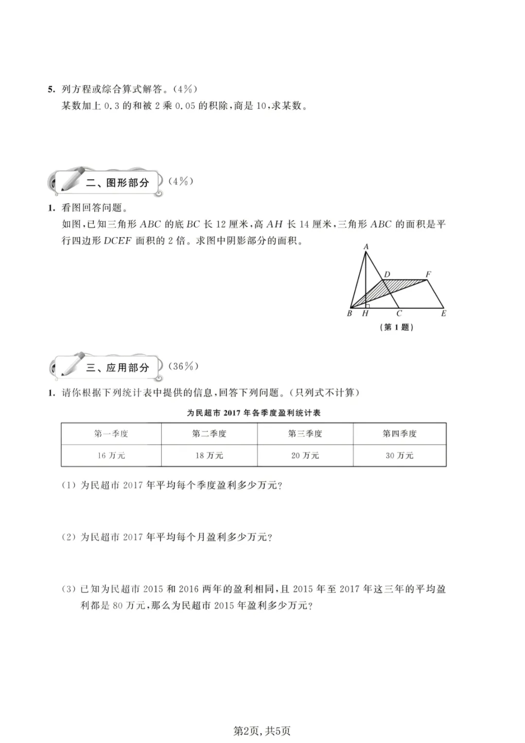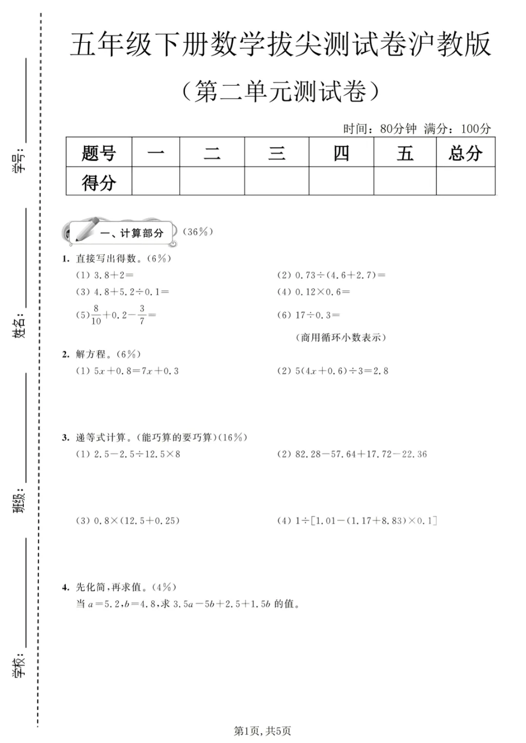 【免费下载】五年级(下)数学 第二单元拔尖测试卷《沪教版》_1,PDF电子版,可打印,共5页