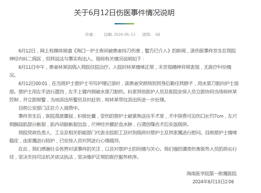 6月12日,网上有媒体报道《海口一护士夜间被患者持刀伤害,警方已介入》的新闻,该伤医事件发生在我院神经内科二病区,但其说法与事实有出入。现将有关情况说明如下: