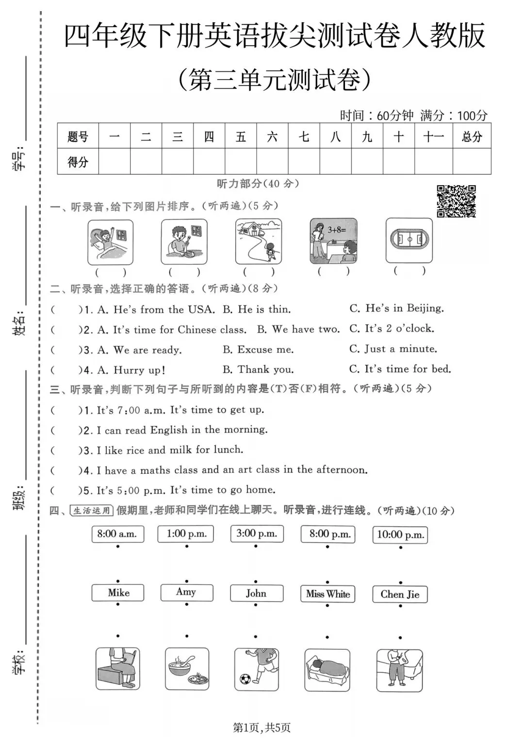 2026春四年级下册人教版PEP版英语《第三单元检测试卷》( 扫码听音频 含答案 共3套) ,可打印