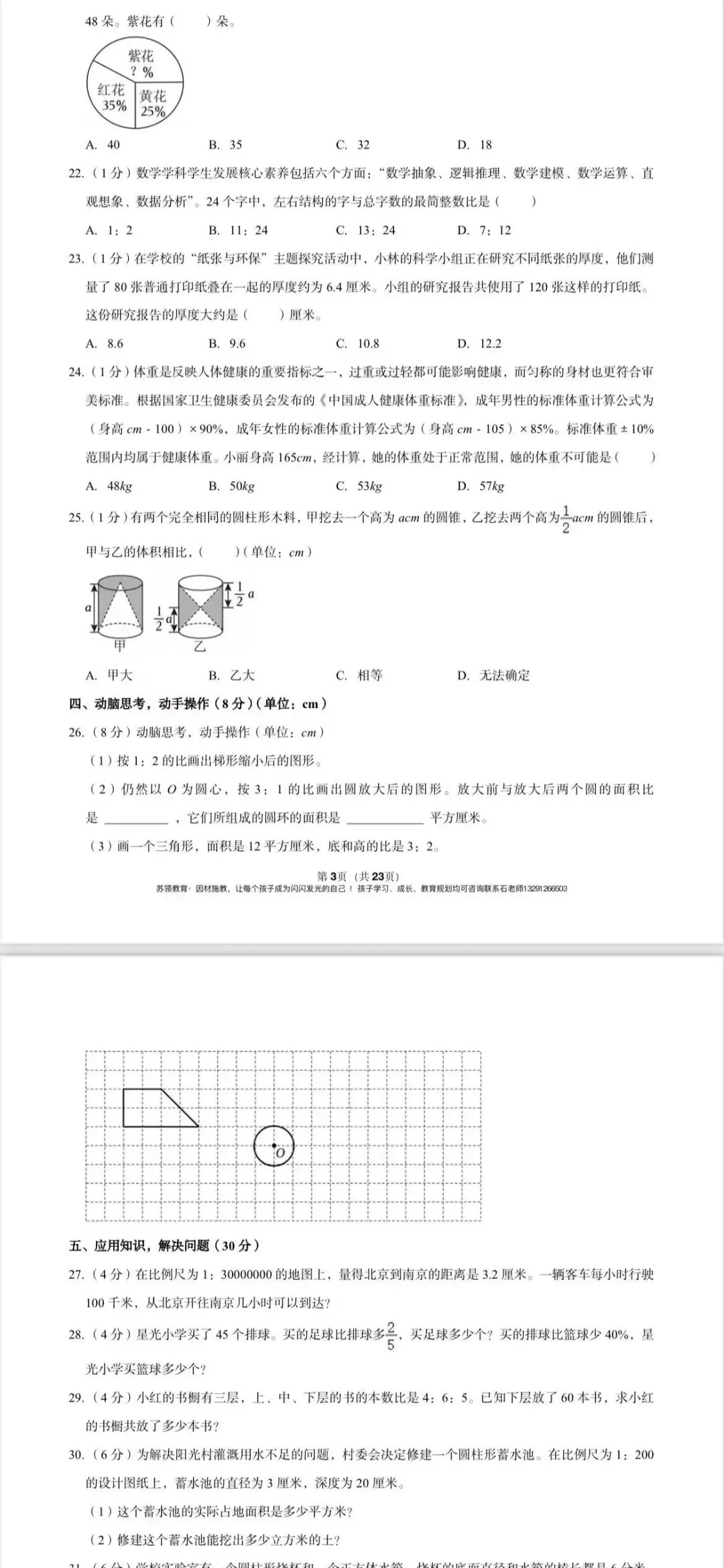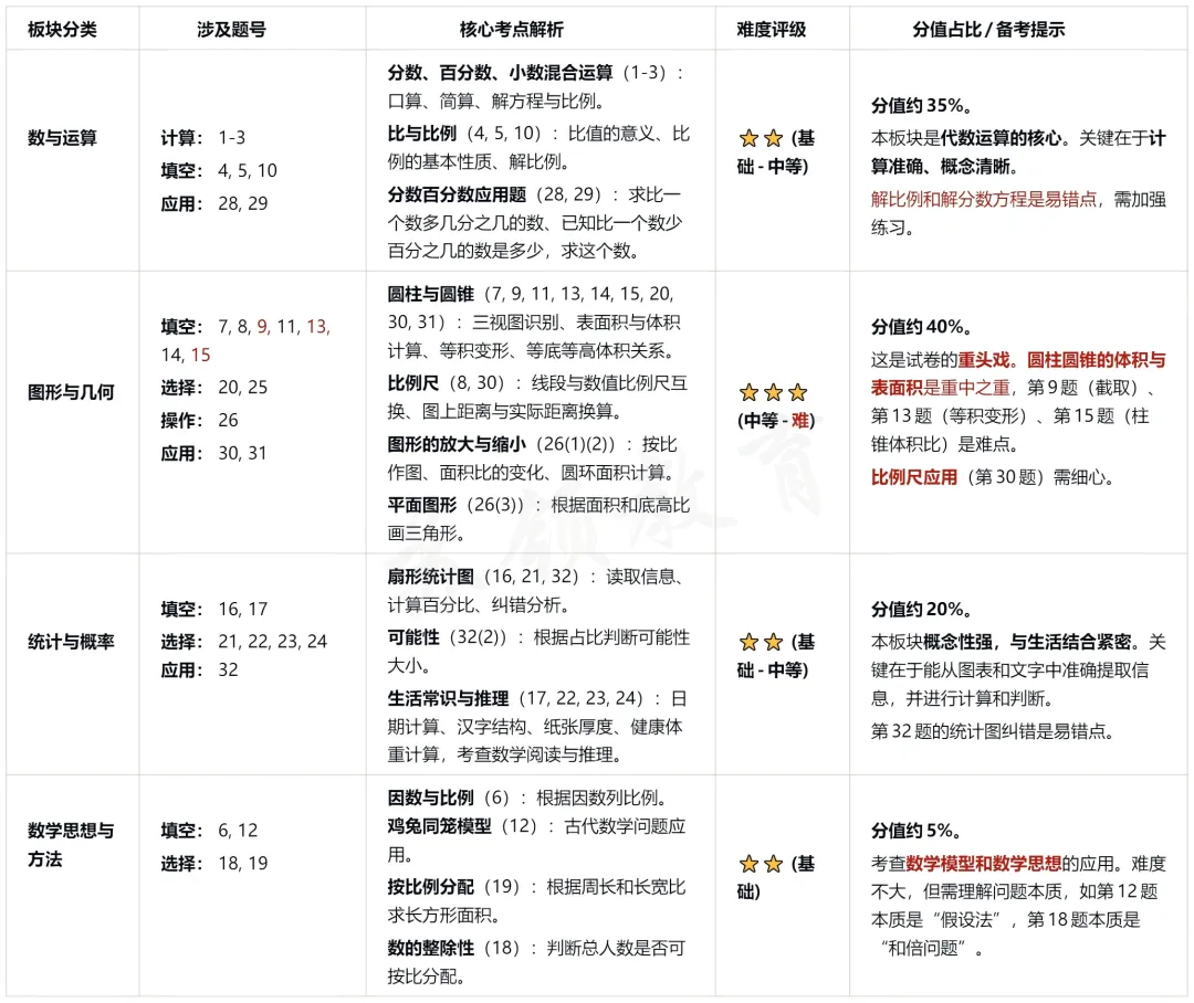思维挑战(约10%):选择题第25题(几何切割体积比较)、解决问题第30-32题(比例尺综合应用、等积变形、统计图分析)是试卷的综合应用难点。这些题目步骤多、情境新、对思维的严谨性和灵活性要求较高。