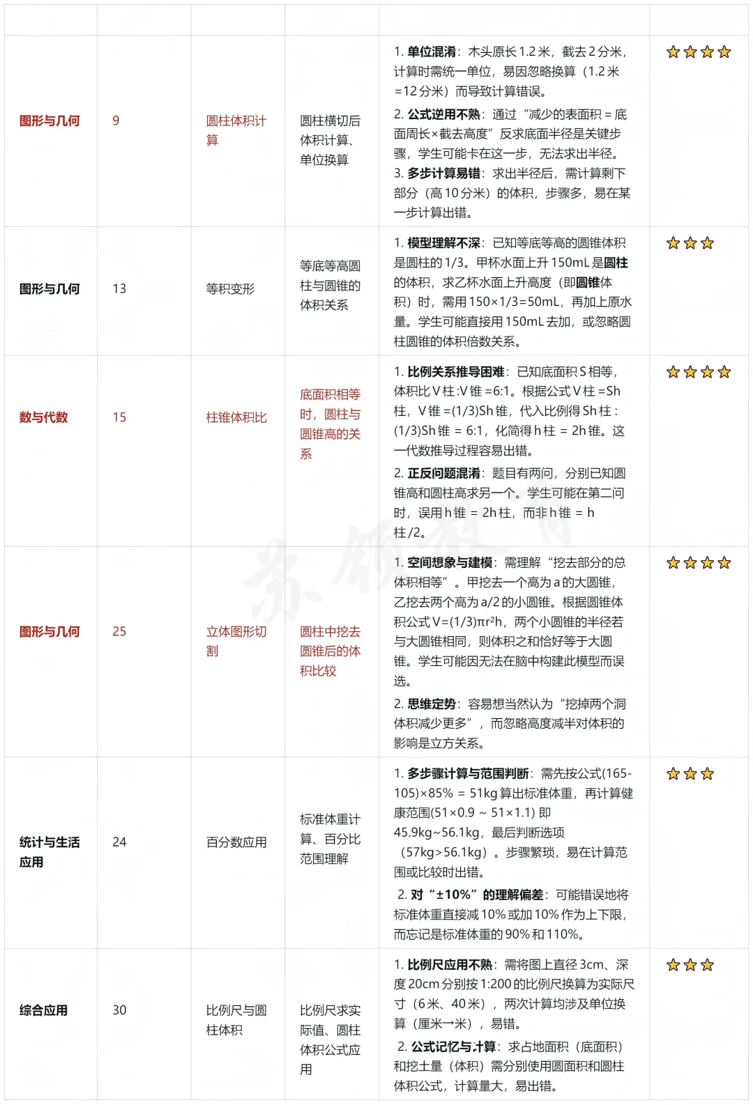 能力区分(约25%):填空题后9题(9-17)、选择题(18-25)、解决问题前3题(27-29)等,需要学生进行信息提取、逻辑推理、模型构建和空间转换。如第9题(圆柱截取)、第12题(鸡兔同笼)、第15题(柱锥体积比)是常见的中档题。