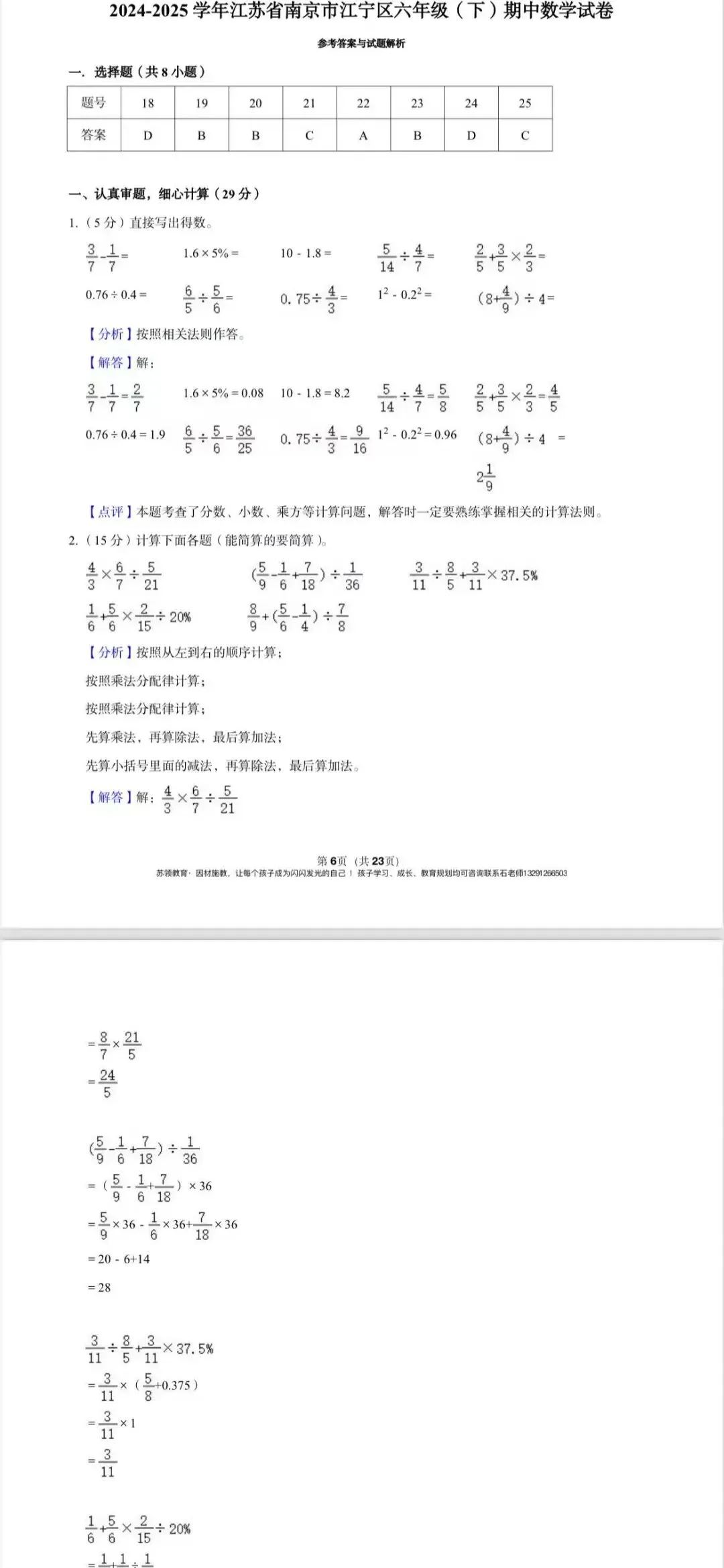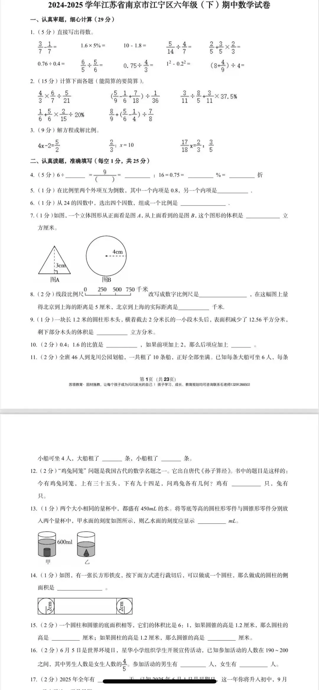 江宁区·六下期中·数学·25年解析(建议可打印出来让孩子自己学会总结考点等)