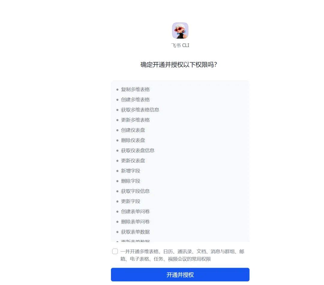 lark-cli auth login --domain all这里会再弹一个链接,打开,在飞书里确认授权。
