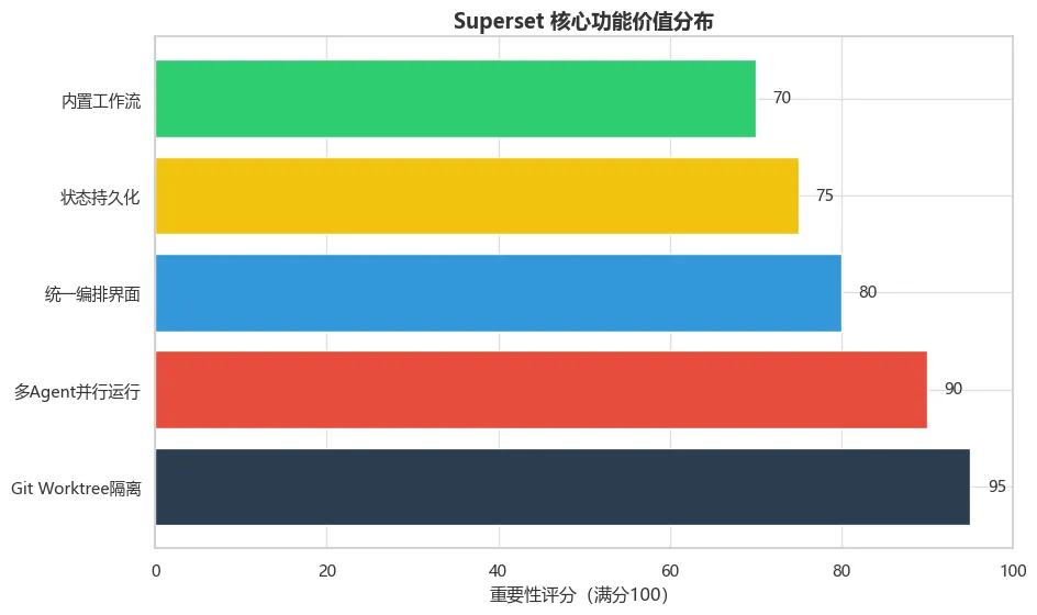 如上图所示,Git Worktree隔离和多Agent并行运行是Superset最核心的价值主张,这两项功能直接解决了多Agent协作的最大痛点。统一编排界面和状态持久化则提供了优秀的使用体验保障。