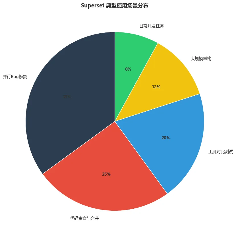 从图2可以看出,并行Bug修复和代码审查与合并是最主要的使用场景,合计占比超过60%,这与Superset的核心价值主张高度吻合。