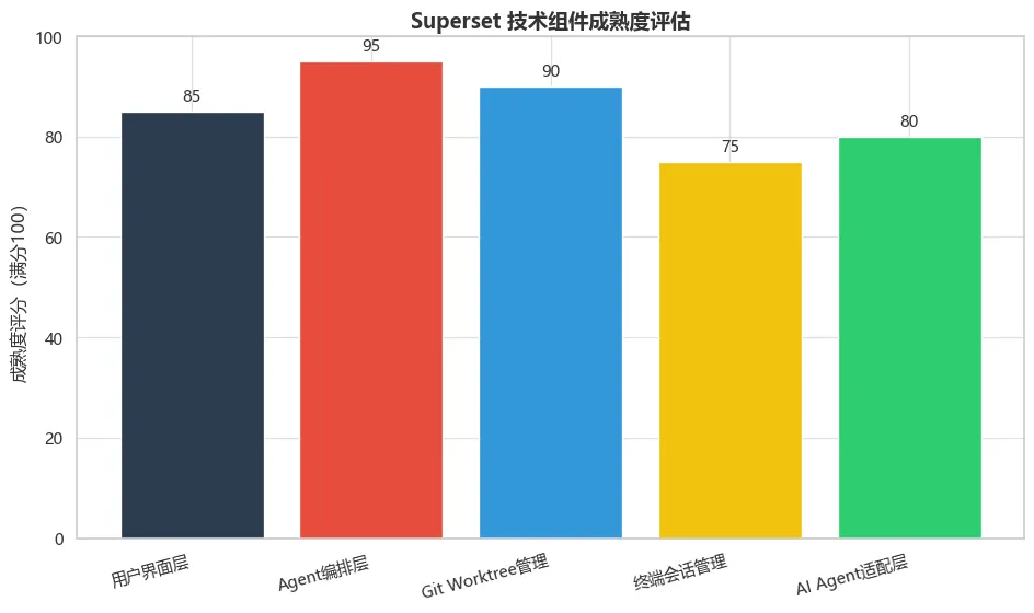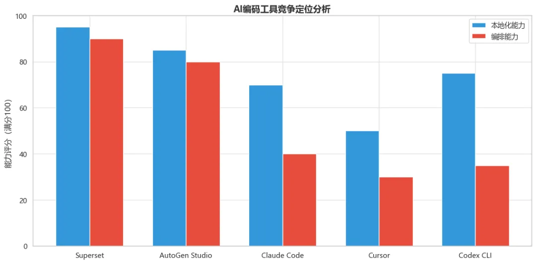 从图5可以清晰看到,Superset在“编排能力”维度上显著领先于所有竞品,这是其核心差异化优势。在“本地化能力”上与AutoGen Studio相当,但领先于Claude Code等闭源工具。