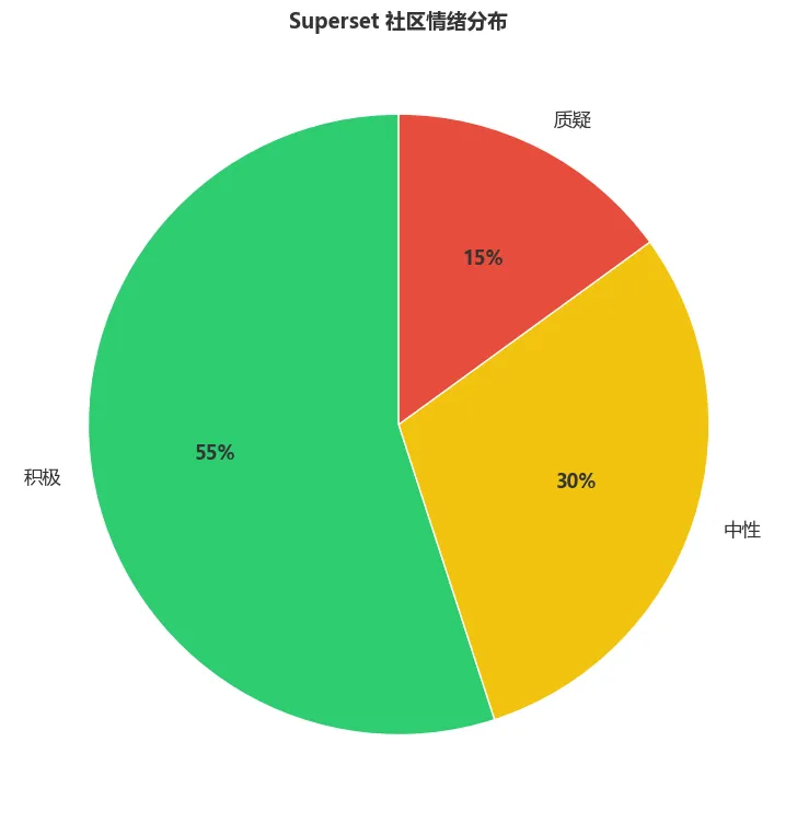 如图4所示,社区对Superset的整体情绪偏向积极,超过半数的反馈表达了明确的认可。这对于一个开发者工具来说是一个良好的信号。