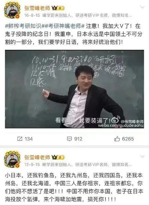 冒充清华北大老师,学历造假,连名字都是假的张雪峰是一个鼓吹丛林法则,优胜劣汰的妄人。他直播时张口闭口就是教训人,把观众当成孙子一样训,俨然自己是一个被优胜劣汰出来的强者。