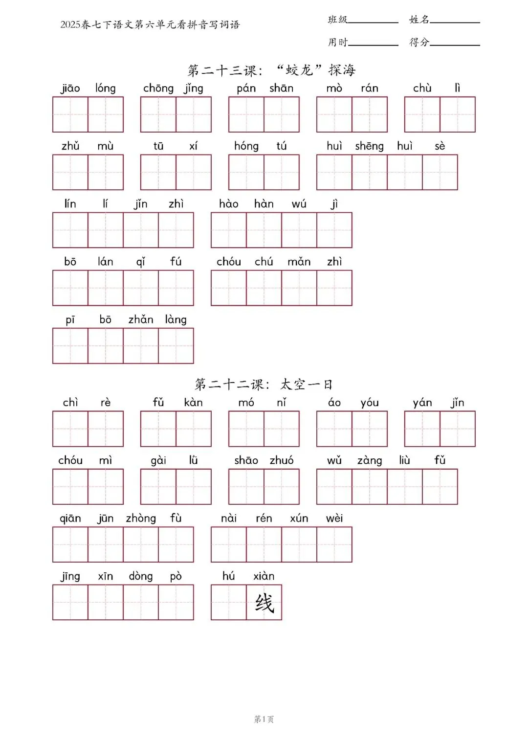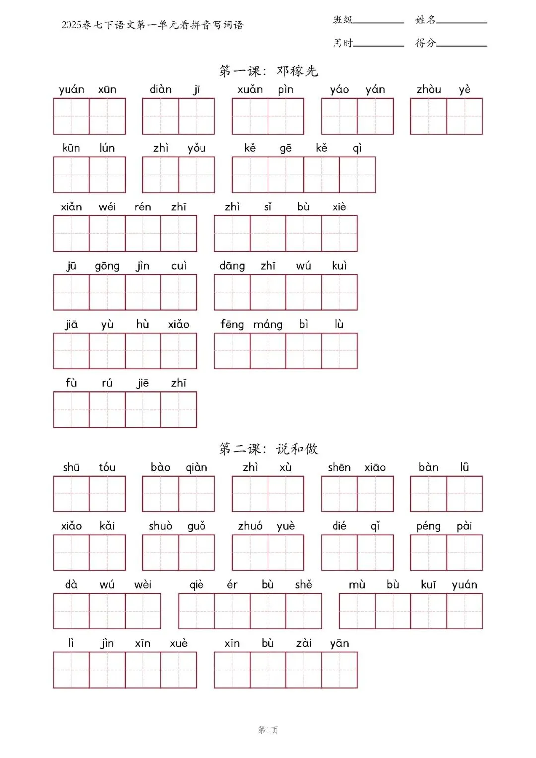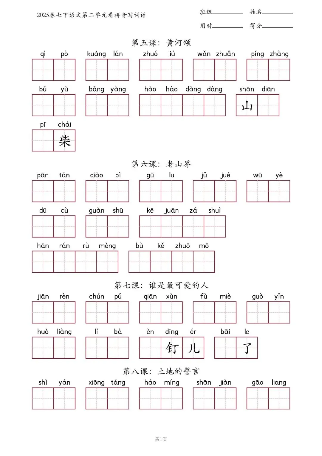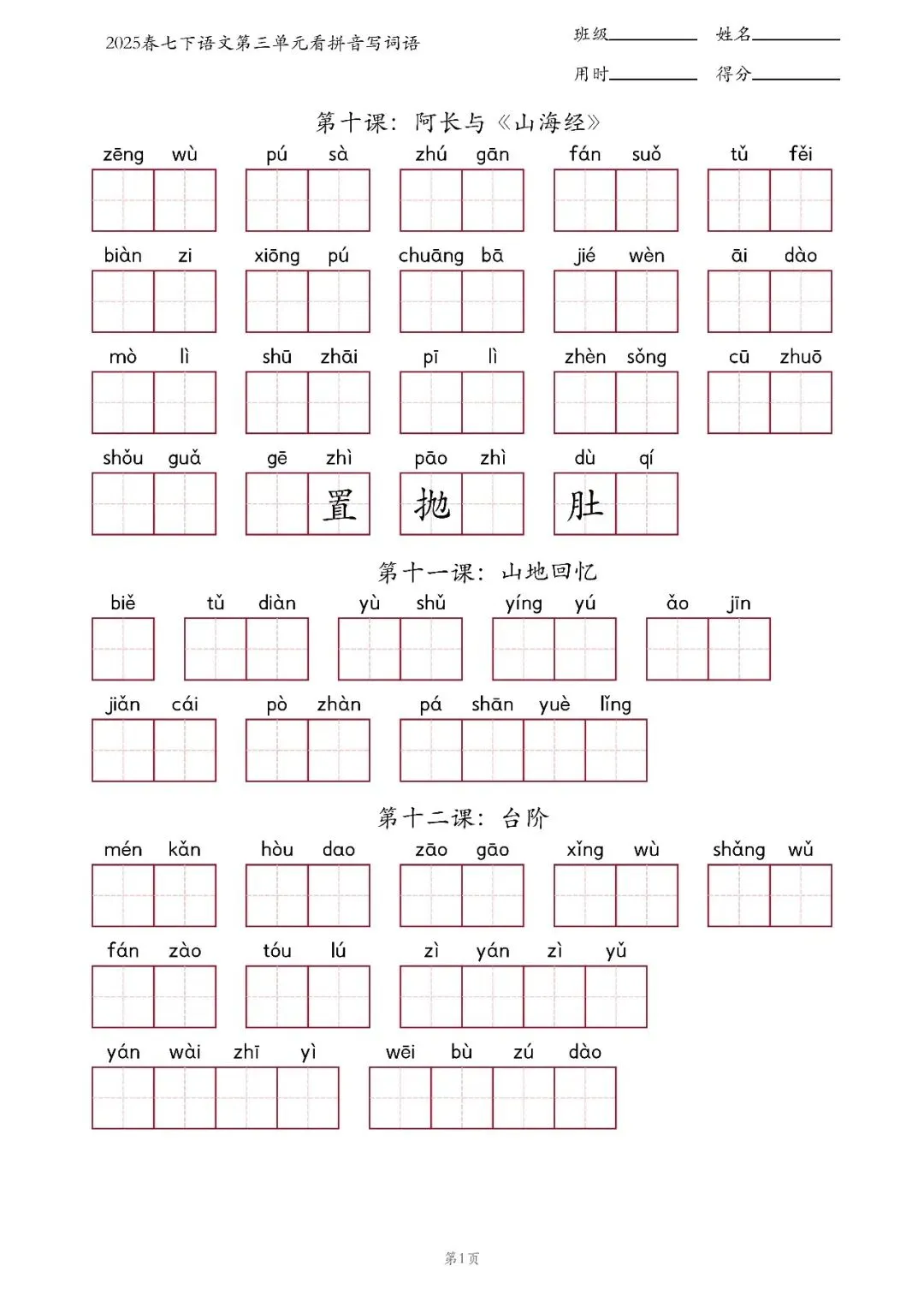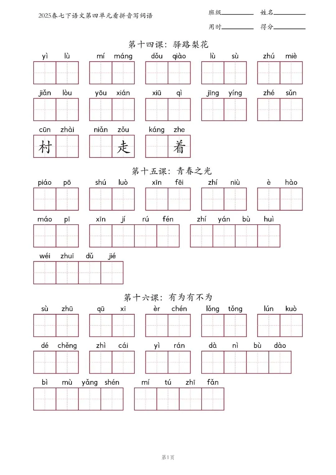 七年级下册语文看拼音写词语练习题目a4(可打印)