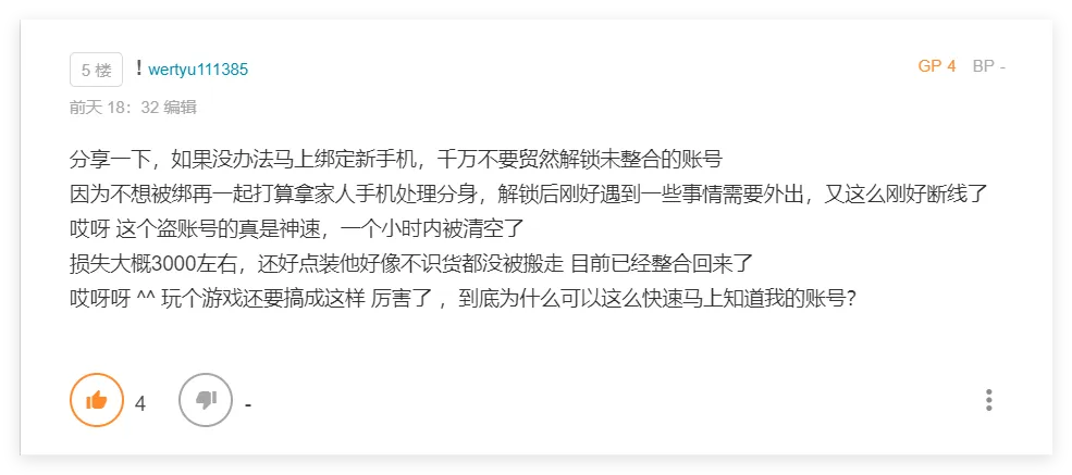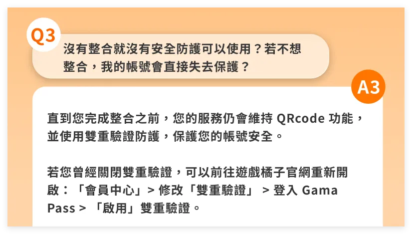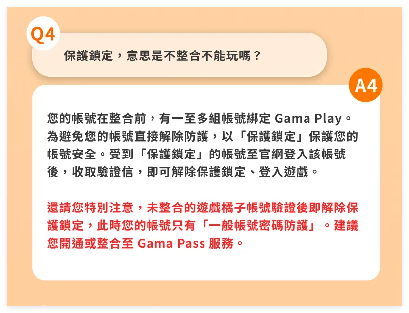 暖基的2个台号整合之后,扫码之后就会直接登录该APP绑定的所有游戏账号。(这里犯蠢把账号整合了,虽然说不太可能卖号,但是万一呢···未来的事情谁敢保证!)PS:下图即为账号整合之后,登录APP就会直接登录2个橘子账号,也就是4个游戏账号。换句话来说,如果你未来有计划出售账号自己的台号,也就是卖APP账号了,所以千万不要整合起来。如果你是打算卖号,一个APP对应一个游戏橘子账号即可。在说下面的内容之前,可以先看一下暖基昨天转发的GAMA PLAY官方说明:【【官方】Gama Play 账号整合最新说明与协助方式】问题3:那我不进行账号可以吗?我的台号会怎么样?解答:在整合活动进行期间,之前已经有开启APP双重验证功能的台号会继续有QRcode的扫码功能继续防护。问题4:不整合,保护锁定该怎么办?在整合活动之前,如果你有1~N个橘子账号绑定了APP,那么未进行整合的账号,会被保护性锁定(封停)。官方解释是,不整合就不会在提供APP双重验证扫码功能的保护,这个期间避免有任何不可抗外力入侵你没整合的账号,所以就用最简单暴力的方式,统一采用保护性封停锁定的方式,将账号锁定起来无法登录。被保护性锁定的账号,可以到官网会员中心登录账号,并进行账号邮件验证,即可解除保护性锁定。解除保护性锁定后,你的台号就失去APP保护功能,只能通过账号+密码的一般方式登录游戏了。这也就是果奔。那么问题来了,没了APP保护的账号自然就成了安全性极低的账号,因为台服这边盗号情况非常严重,有各种花样的暴力撞号手段,盗号风险直接拉到MAX。这边要再提一下,如果你只有一个游戏账号,那么完全不用担心整合问题,如上文提到【1个APP对应绑定1个游戏橘子通行证账号】,以后就算要卖号,连着APP账号一起卖掉即可。所以你是只有一个账号的情况下,开APP防护没有任何问题,这里针对的是多号党。(疑似官方在打击台号代绑)郑重PS:这里只针对当下情况是这样,但未来不保证官方会添加其他限制。不要以后出问题来找我麻烦。