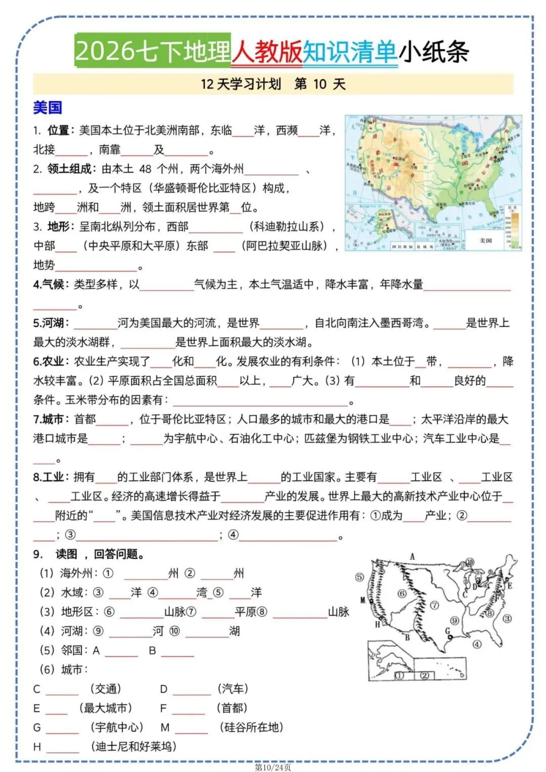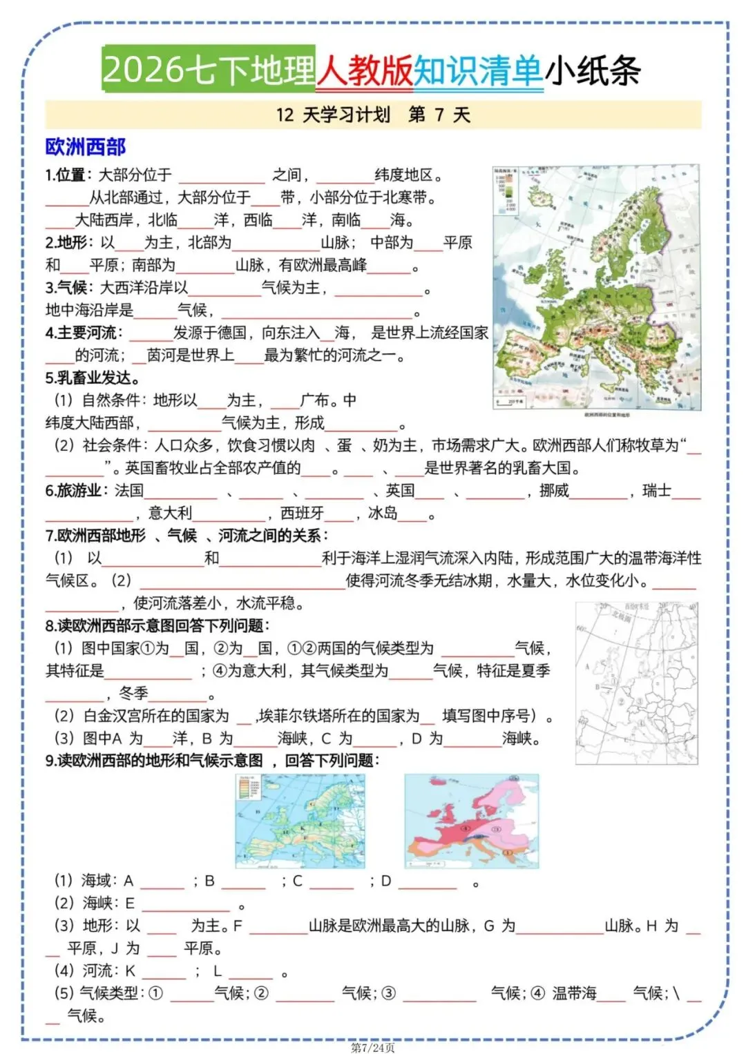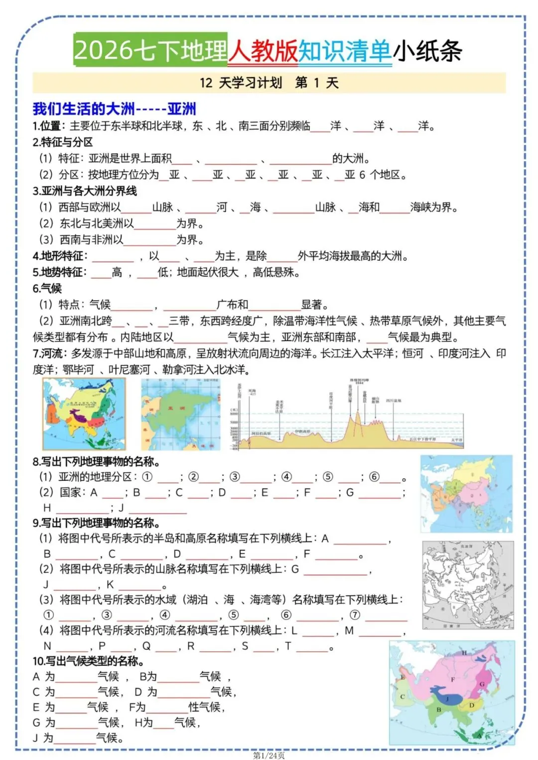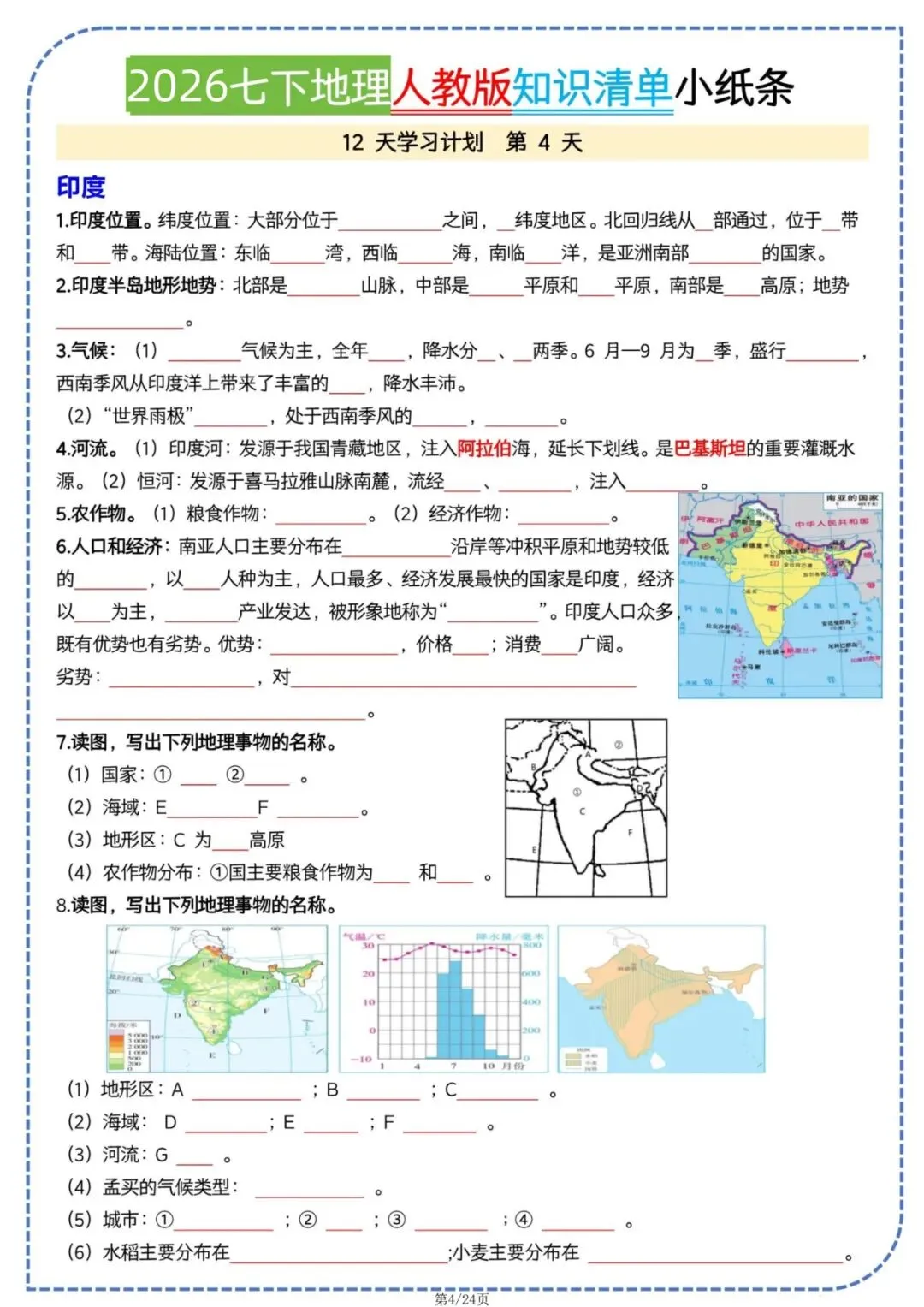 七年级下册地理人教版知识清单小纸条电子版可打印
