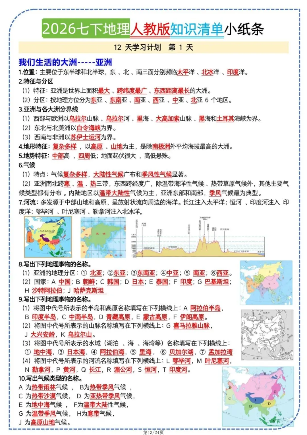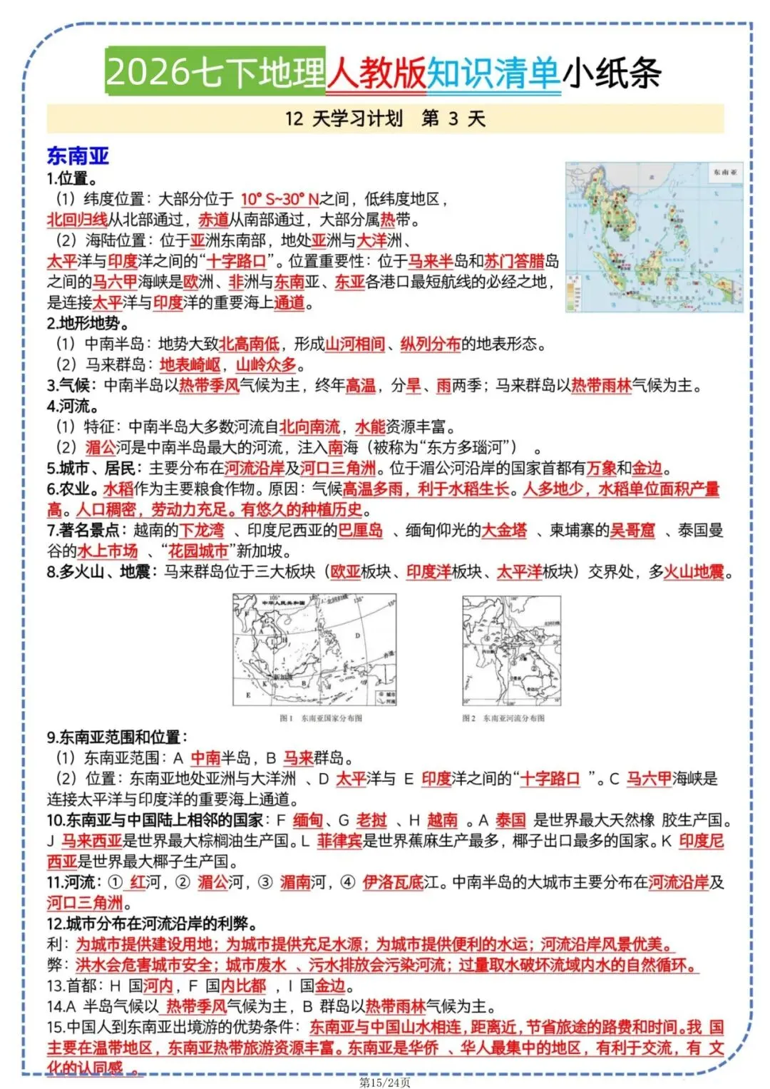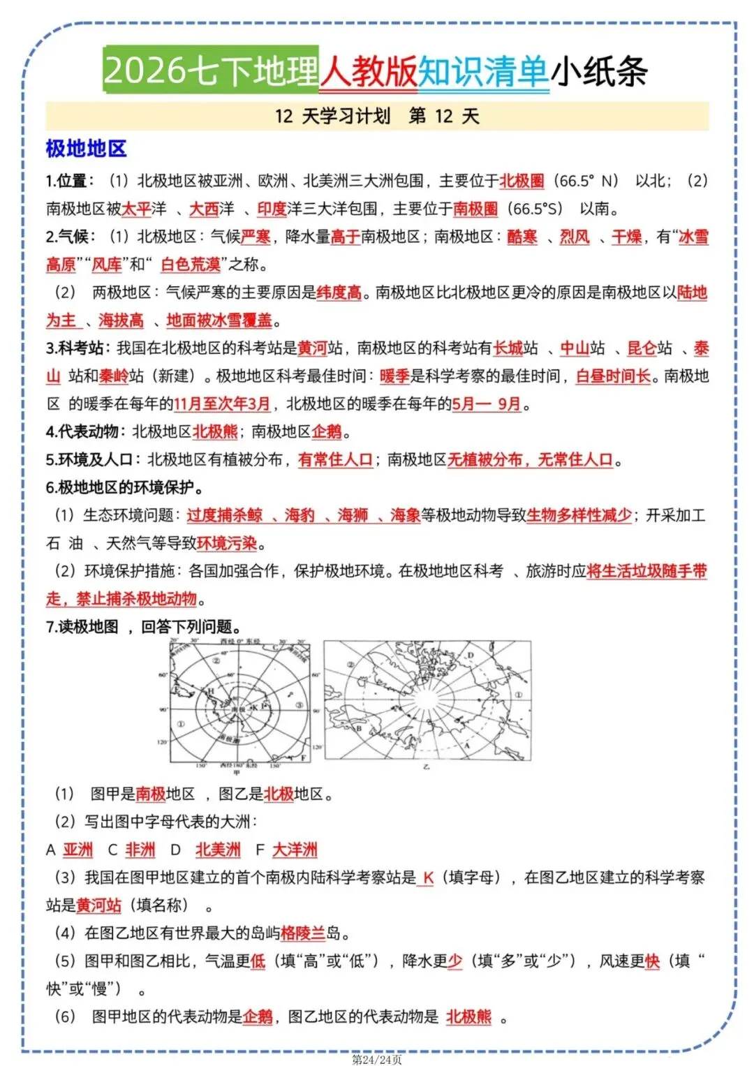 今日老师为大家整理了学习辅导内容:七年级下册地理人教版知识清单小纸条电子版可打印