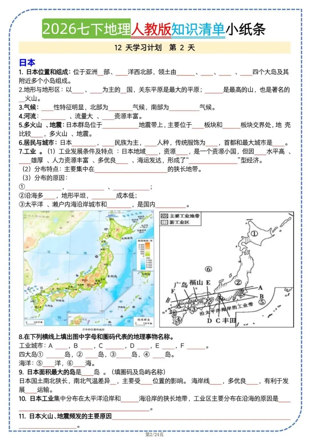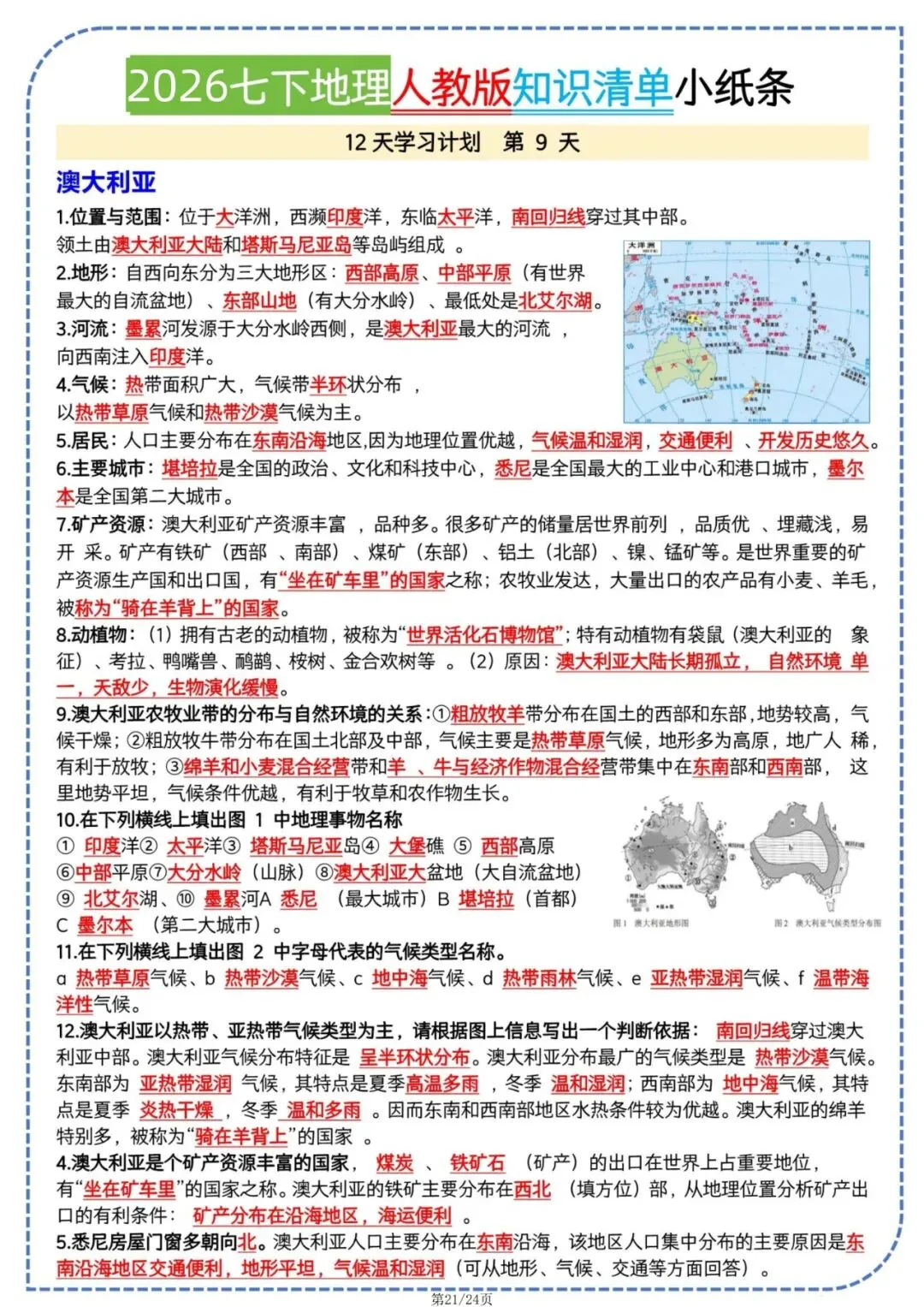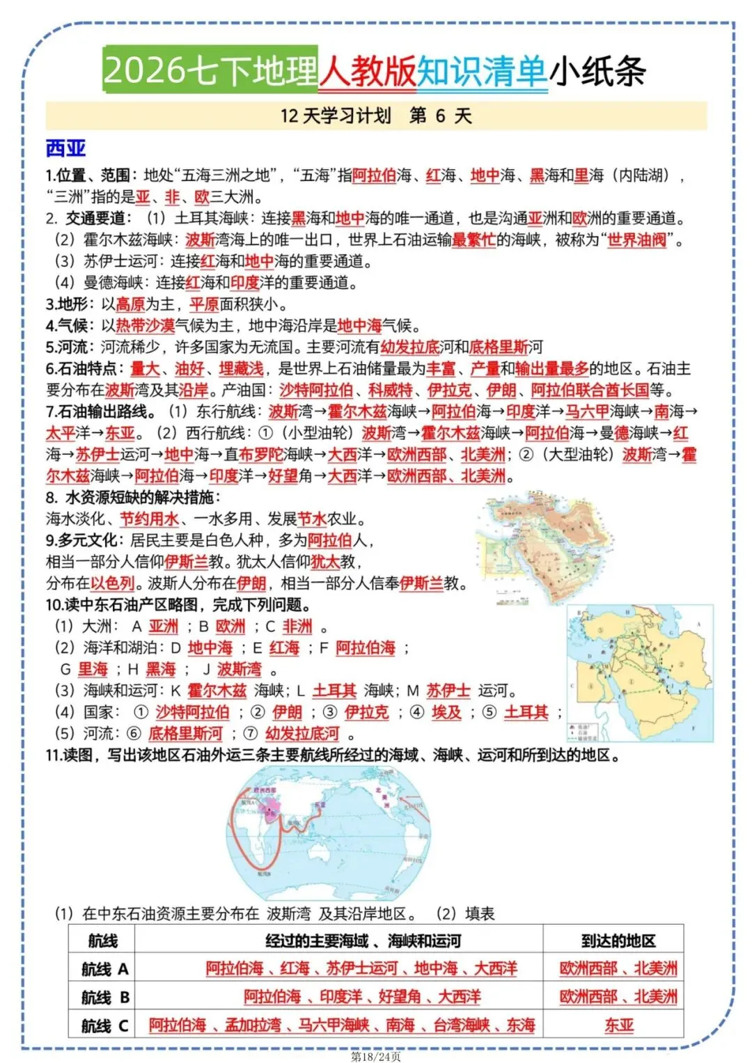 今日老师为大家整理了学习辅导内容:七年级下册地理人教版知识清单小纸条电子版可打印