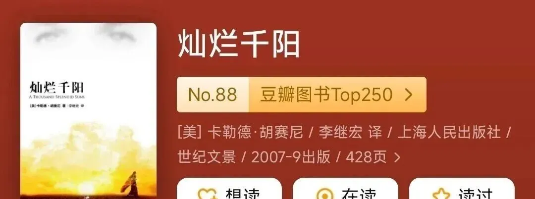 《灿烂千阳》(A Thousand Splendid Suns)是 “阿富汗的托尔斯泰” 卡勒德・胡赛尼继《追风筝的人》之后于 2007 年 5 月推出的第二部长篇小说,2007 年 9 月上海人民出版社引进中文版,译者李继宏,被誉为 “女性版《追风筝的人》”,BBC 评为 “最鼓舞人心的 100 部英文小说” 之一。全书以阿富汗三十年战乱为背景,讲述私生女玛丽雅姆与战乱孤女莱拉被迫嫁给同一个暴戾鞋匠拉希德,从水火不容到缔结如母女般的情谊,在家庭暴力与战火阴影中守望互助、以生命换取彼此自由的故事,书名源自波斯诗人赛依伯的诗句,象征女性在绝境中迸发的人性光辉与生命力量,既揭露父权压迫与战争创伤,也赞颂跨越苦难的女性情谊与不可毁灭的爱