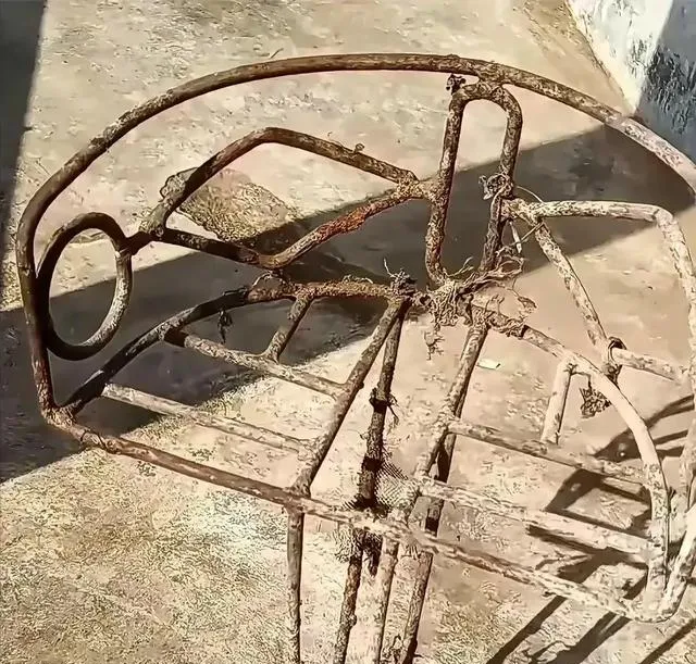 铁家伙生了锈,样子还很唬人,这东西是老式儿童车架。讲真,这个真得有点年头了,八零九零后的都未必见过,家里那辆二八大杠,自行车铃儿清脆一响,前头搁上这么个架子,小孩子往里一塞,铁凉屁股硬,却巴巴地等着大人带着上街转,至于安全不安全没人管,开心就得了。骑着回家,一路风都是自由味道,那点酸爽,现在的小朋友别提了,谁也想象不出来。