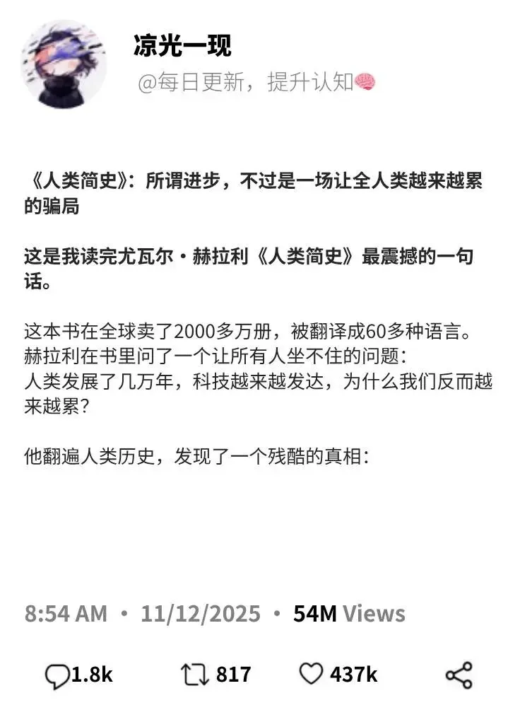 最近,我重读了一本珍藏已久的电子书——尤瓦尔·赫拉利的《人类简史:从动物到上帝》。读完后,我再次被那种“脑洞大开”的震撼感击中,仿佛大脑经历了一场剧烈的升级。今天,我想把这份震撼分享给你,并邀请你一起加入这场关于人类命运的深度思考。
