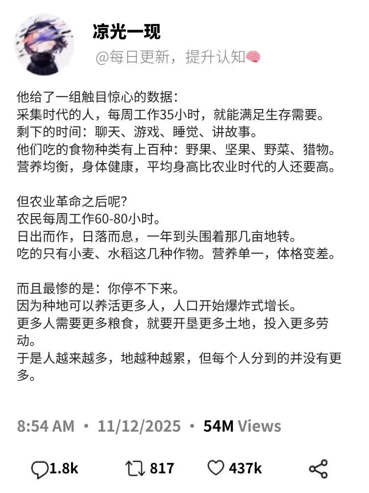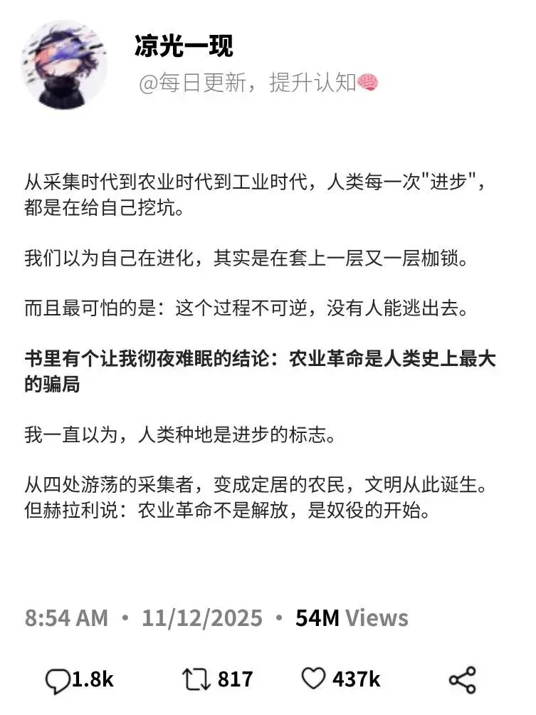这是全书最让我“背脊发凉”的章节。作者认为,农业革命并非人类的进步,而是“小麦驯化了人类”。为了照顾小麦,人类放弃了狩猎采集时代相对轻松的生活,陷入了更繁重的劳作、更差的饮食和更多的疾病中。这种“演化上的成功”并不等同于“个体的幸福”。读到这里,你或许会重新审视现代生活的忙碌与焦虑:我们究竟是在驾驭生活,还是被生活所驯化?