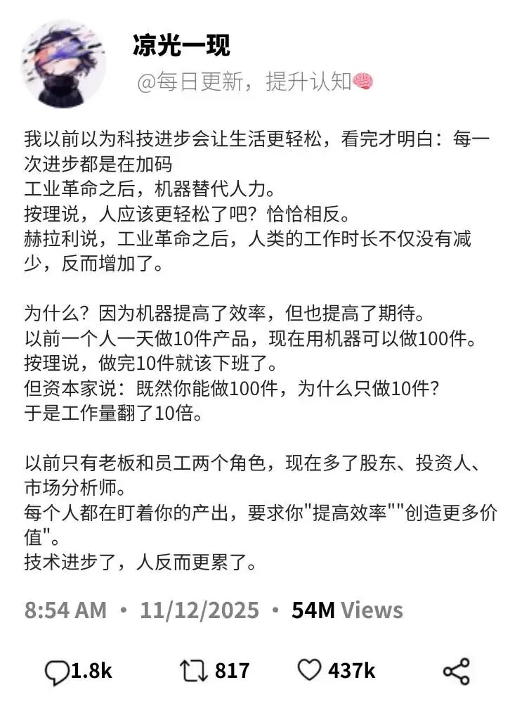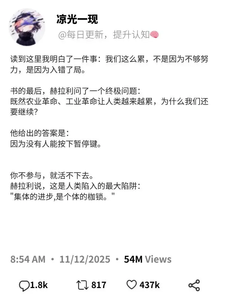 比尔·盖茨和扎克伯格都曾极力推荐这本书,因为它不仅关乎过去,更关乎未来。在人工智能(AI)日益强大的今天,赫拉利的警示显得尤为振聋发聩:如果人类不能重新审视自己的价值观,不能建立真正的全球合作,我们创造的技术可能会反过来统治我们。