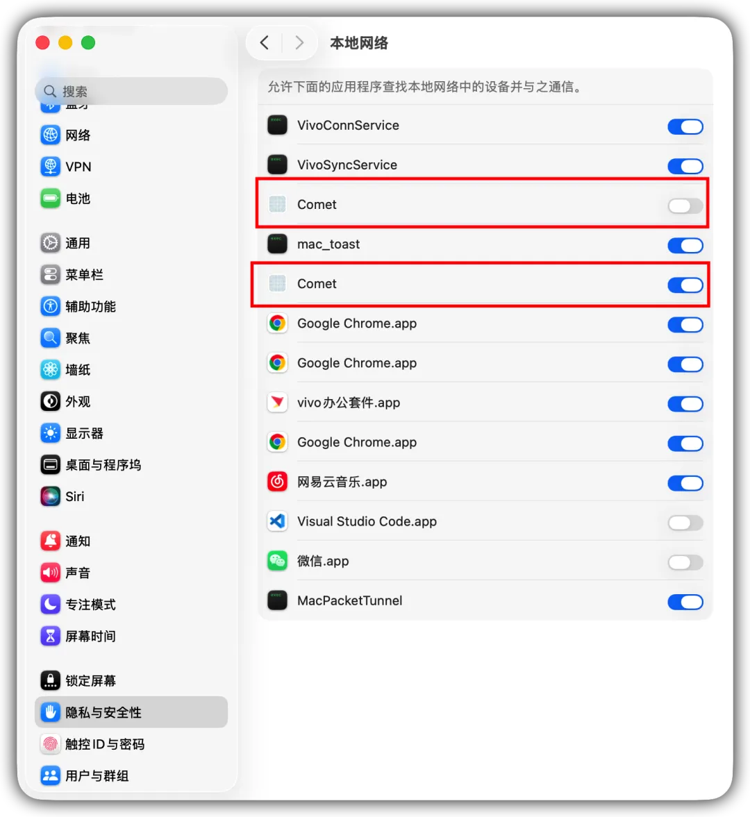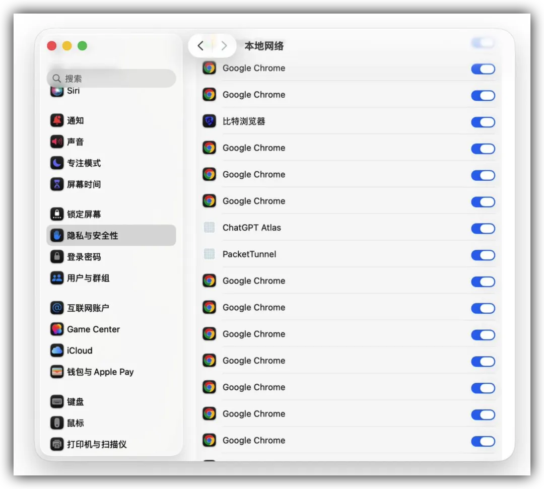 打开 系统设置 → 隐私与安全性 → 本地网络,你可能会看到两种异常。一种是已经卸载的 App 还留在列表里,怎么也去不掉。另一种是同一个 App 出现了大量重复条目,严重的时候整页都是 Chrome。